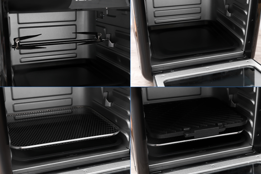 - Thiết kế kết hợp nồi chiên không dầu và lò nướng, khoang lò rộng, cửa kính trong suốt, nhiều phụ kiện đi kèm.