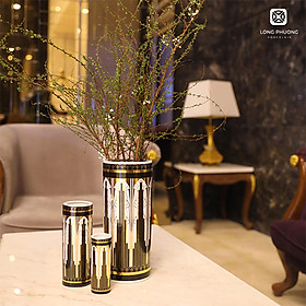 Hình dáng và màu sắc của lọ hoa Kim Lai mang phong cách hiện đại này, sản phẩm mang hình trụ tròn và đan xen hai màu sắc đen và vàng kim tượng trưng cho sự quyền lực và khát vọng vươn lên mạnh mẽ.