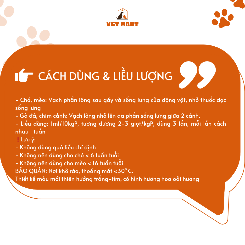- Chó, mèo: Vạch phần lông sau gáy và sống lưng của động vật, nhỏ thuốc dọc sống lưng