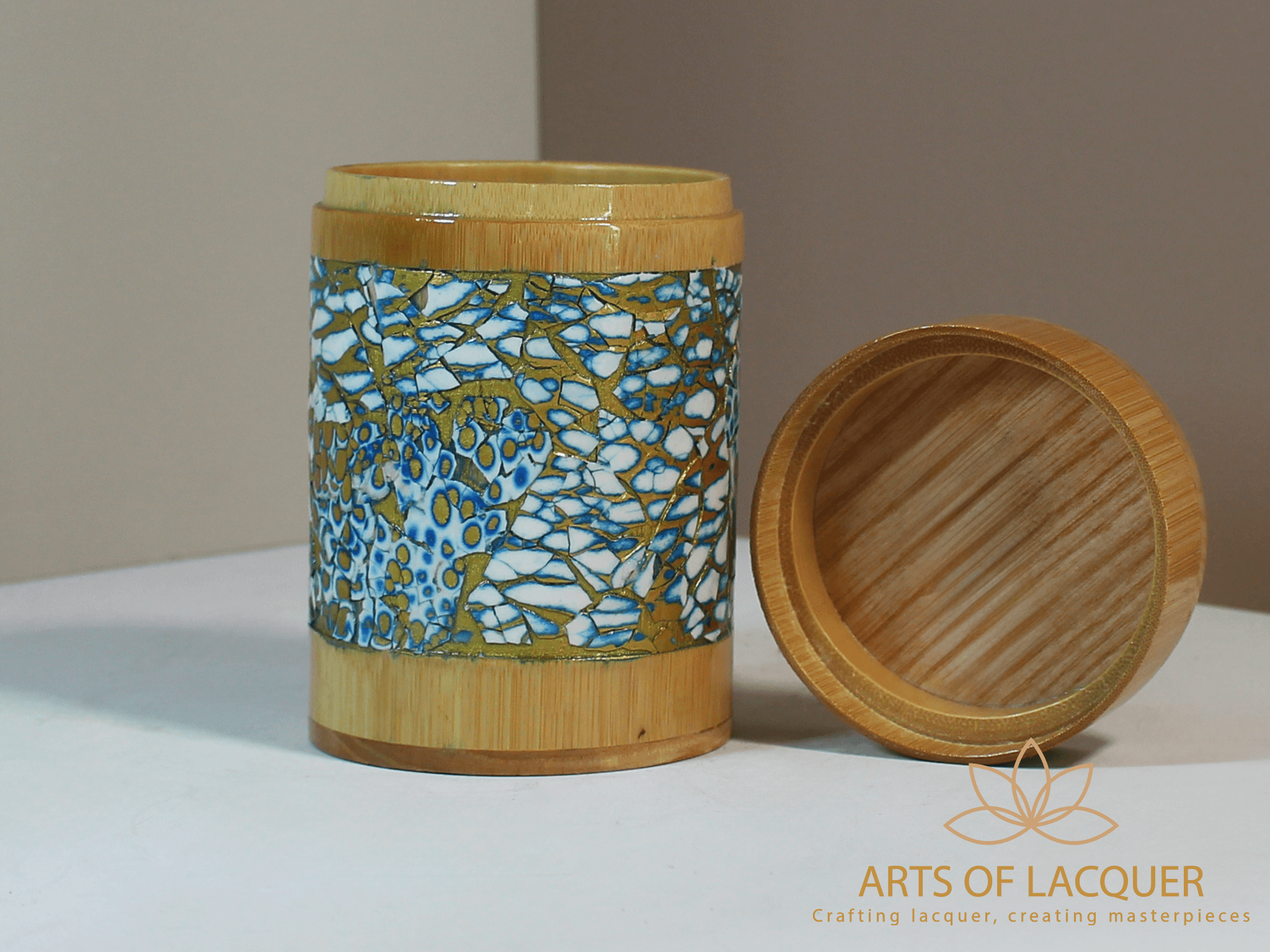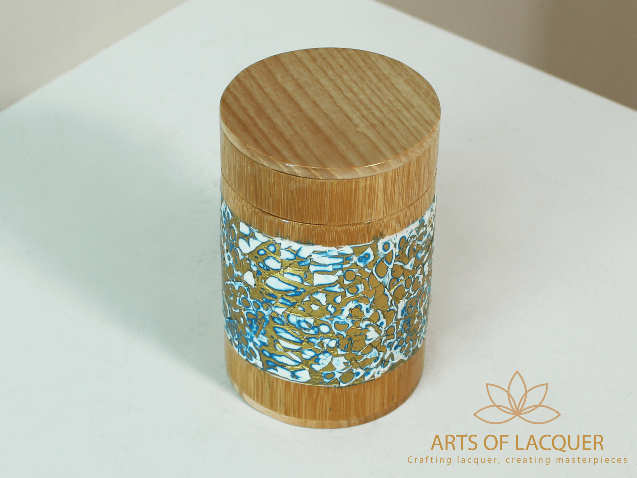 Sản phẩm trong hình là "Lọ Tre Sơn Mài Khảm Trai Xanh Biển" từ Arts of Lacquer. Hộp có thiết kế tròn với nền màu vàng nhạt, được trang trí bằng hoa văn tinh xảo