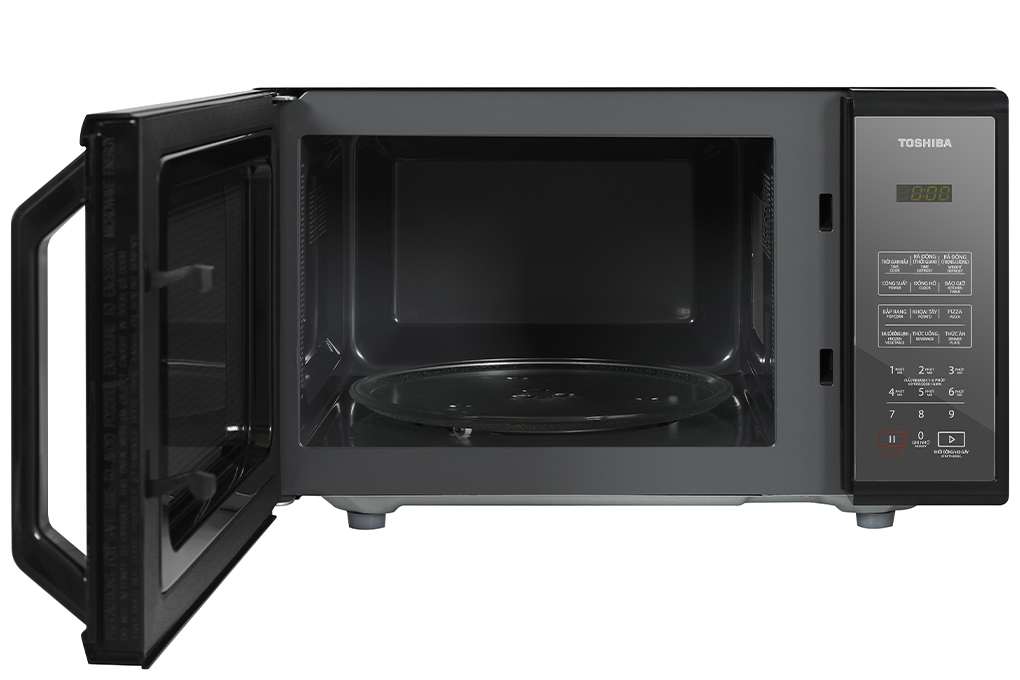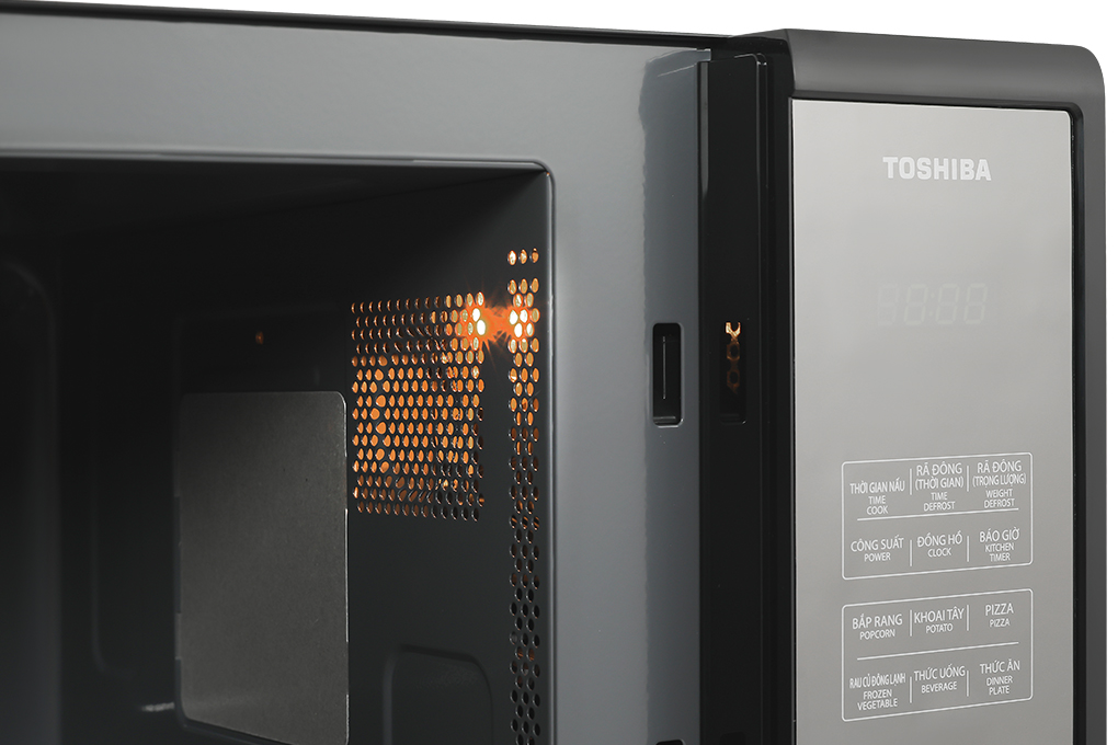 Lò vi sóng Toshiba kết cấu vững chắc, thiết kế tinh xảo, đẹp mắt, dung tích 23 lít chế biến được gà nguyên con khoảng 1 kg. Cửa lò bằng kính cao cấp, sáng bóng, chống trầy, khoang
