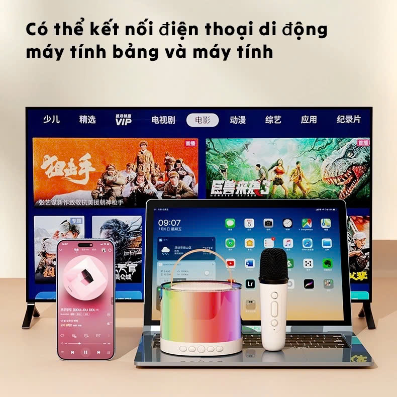 Loa Bluetooth Mini Karaoke Không Dây, Kèm 2 Mic, Âm Thanh Sống Động, Đèn LED 16 Màu