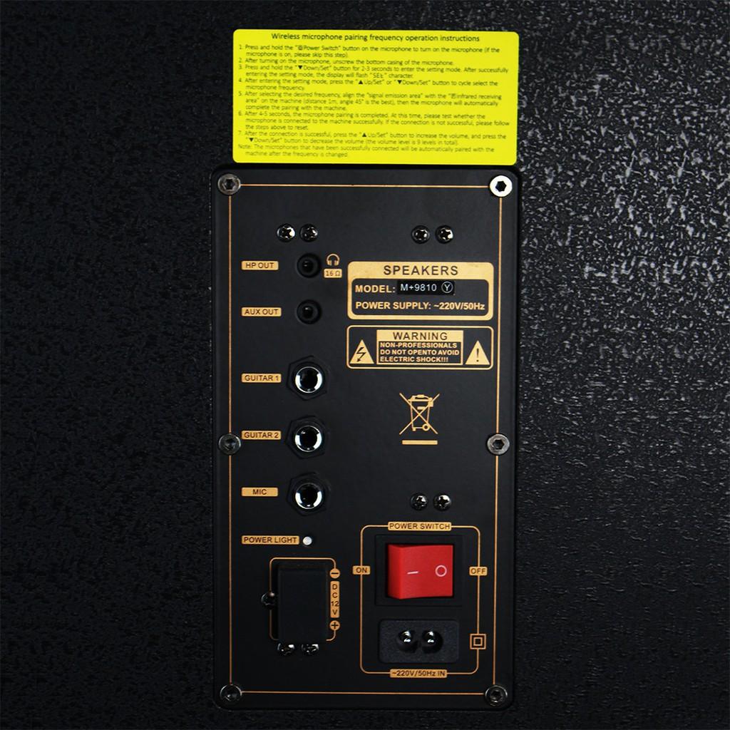 _Nguồn DC 12V bat in _ Bass 2T x 2, Treble x 10 _ Sử dụng bo CLASS D _Hỗ trợ USB, HDMI, Bluetooth, guitar in, mic in _Phụ kiện 2 mic cầm tay không