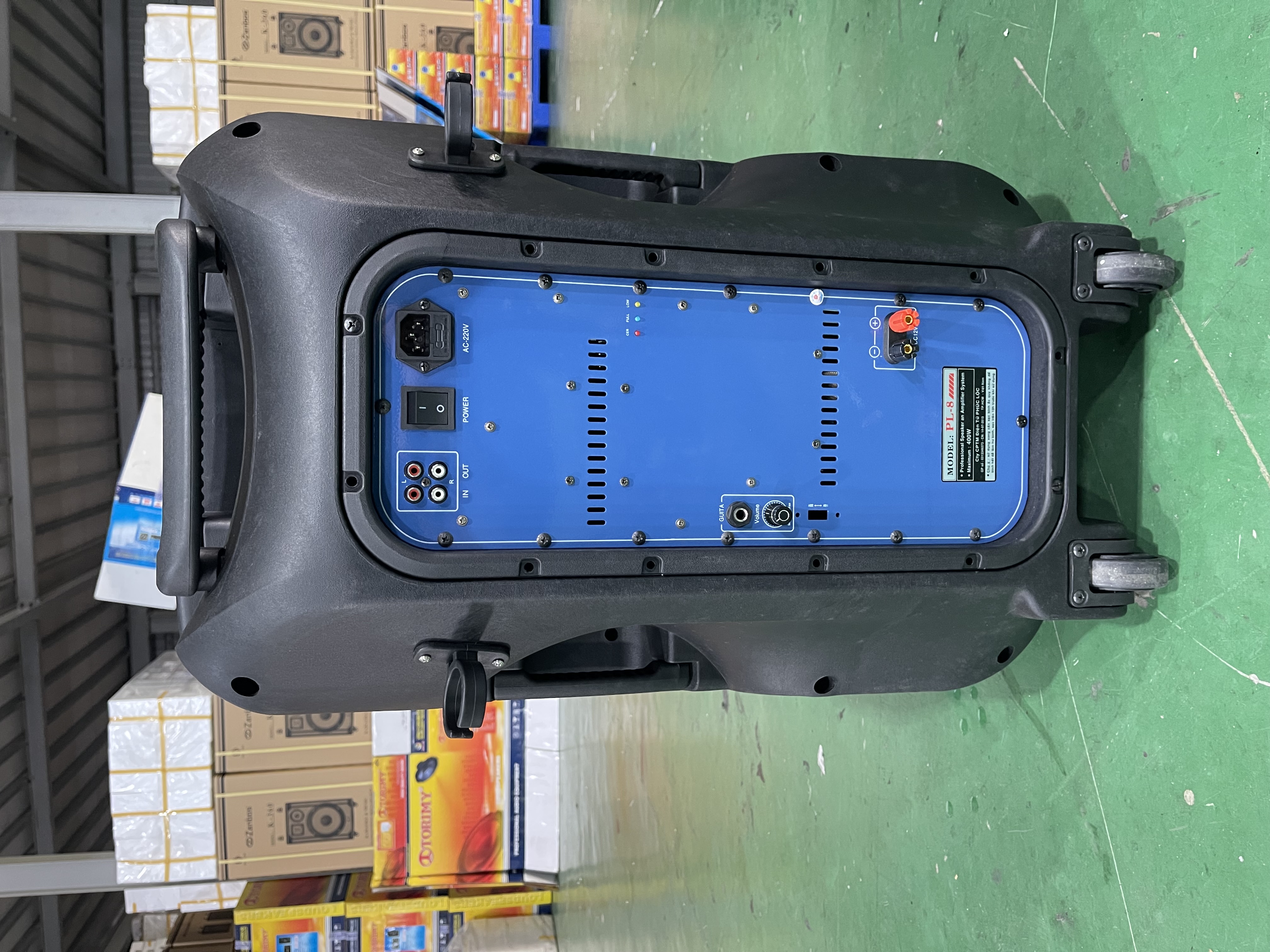 _Nguồn DC 12V bat in _ Bass 2T x 2, Treble x 10 _ Sử dụng bo CLASS D _Hỗ trợ USB, HDMI, Bluetooth, guitar in, mic in _Phụ kiện 2 mic cầm tay không