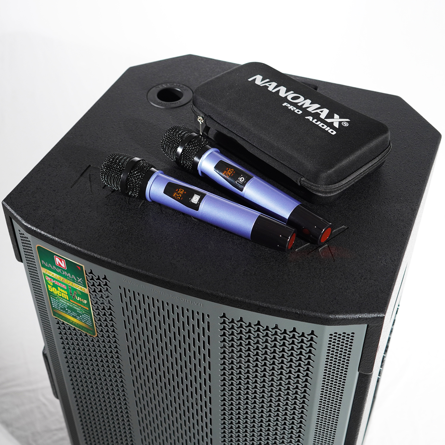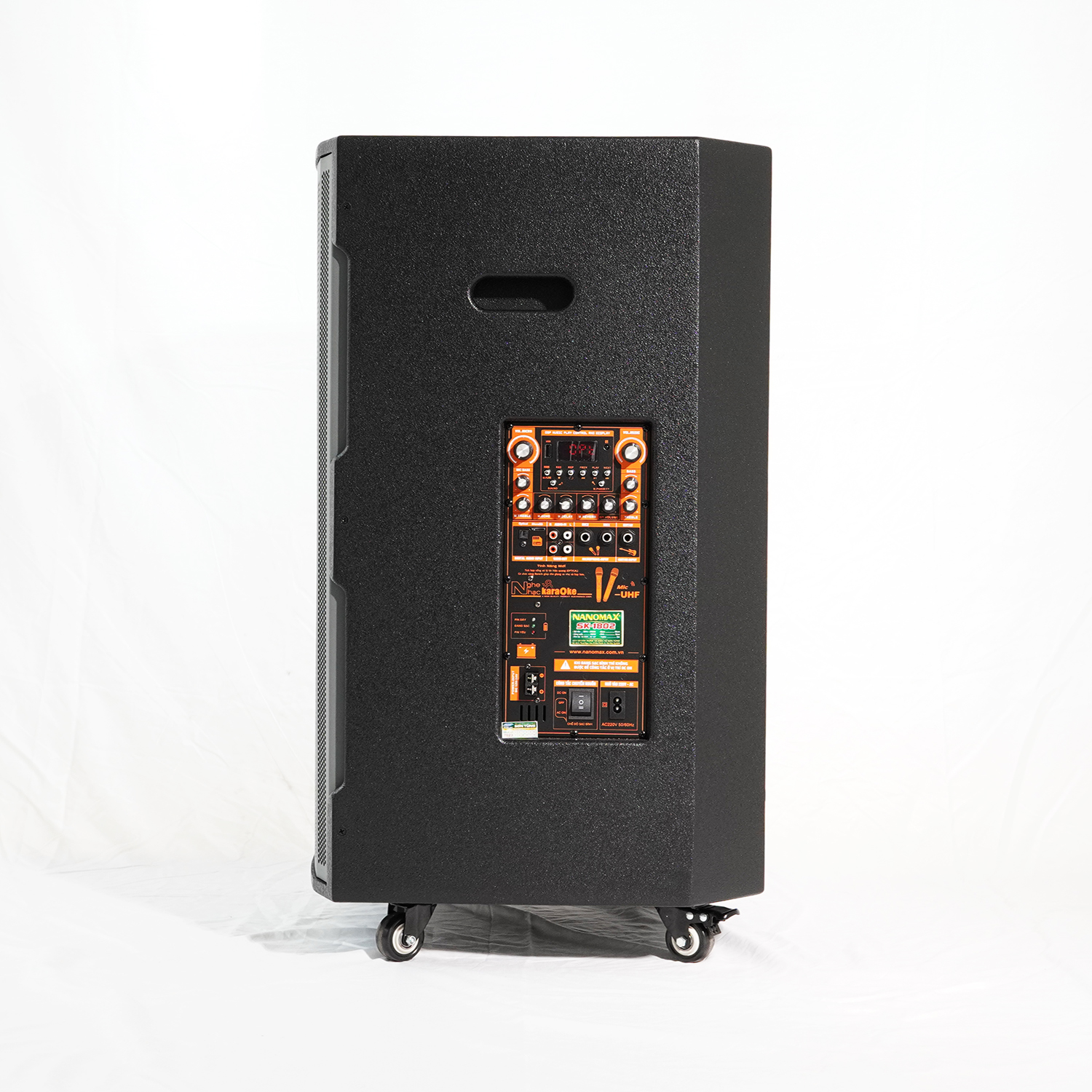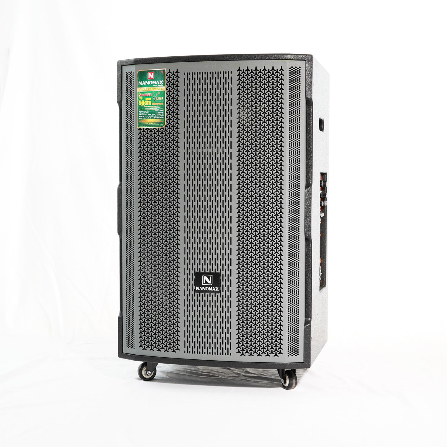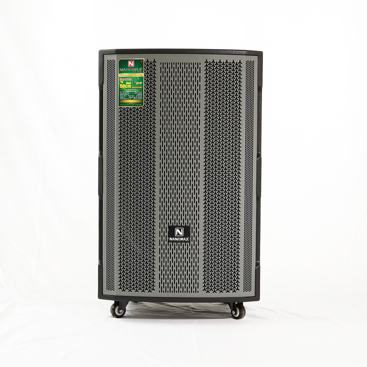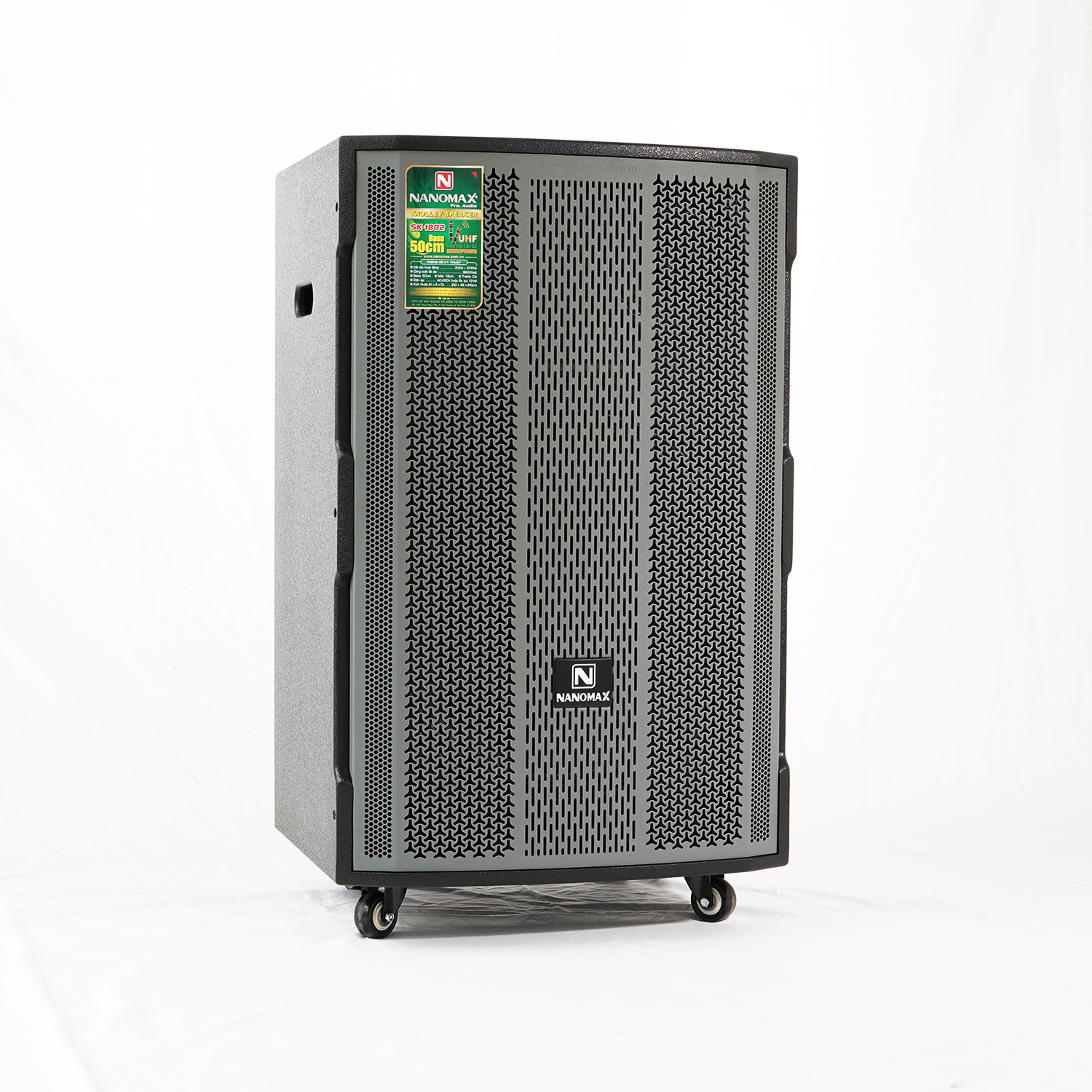 • Loại: Karaoke di động • Số đường tiếng: 03 • Công suất: 960W • Thời gian sạc: 7 tiếng • Thời gian dùng: 4-7 tiếng • Loa Bass: 50cm • Loa Mid: 16cm • Loa Treble: Treble còi • Kết nối không dây: Bluetooth 5.0 • Micro: Không dây band tần UHF • Tiện ích: Cổng USB, thẻ nhớ, mic có dây 6.5 x2; Jack guitar 6.5, Audio In/Output 3.5 • Kích thước/ Trọng lượng: (51 x 47 x 84)cm / 36kg • Chất liệu thùng: Gỗ sơn gai chống trầy • Sản xuất tại: Việt Nam • Thương hiệu: Nanomax • Sử dụng nguồn: AC 220V hoặc Ắc qui 12V/20A • Phụ kiện: 1 dây sạc, 2 micro, 4 pin và 1 hướng dẫn