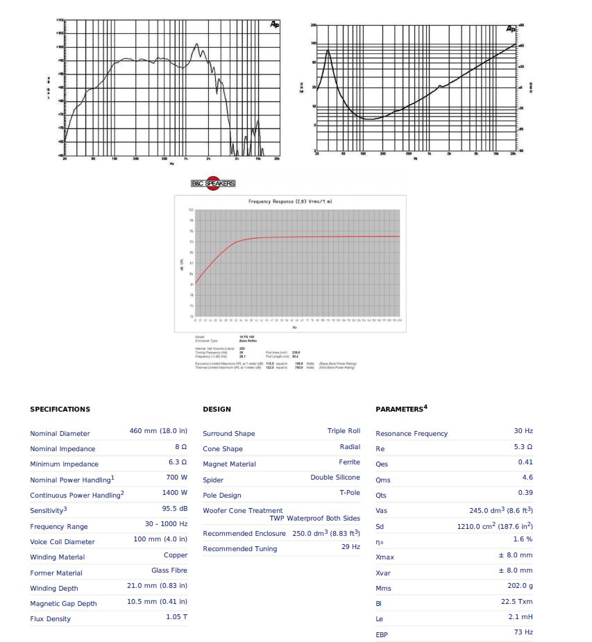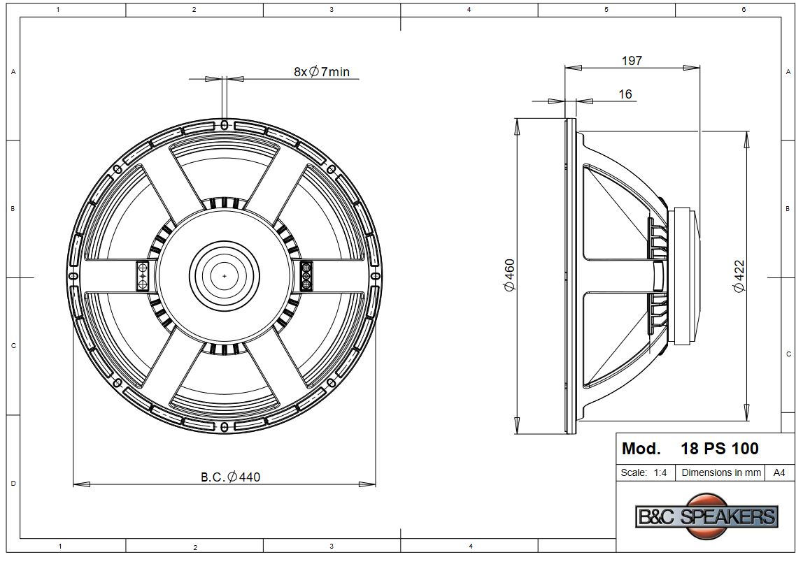Mua tại TiktokLOA RỜI SUB 5 TẤC B&C Xuất xứ : ITALIA Voice coil bằng đồng khổ lớn 4" (100mm) cao 21mm Công Suất Program 1400 W Dải tần: 30-1000 hz Độ nhạy: 95,5 db Nam châm Ferrite Mạng nhện đôi bằng silicone Voice coil loa B&C SPEAKERS 18PS100 được thiết kế có độthông thoáng nhất định giúp bảo vệ loa. Kích thước loa: 460 x 197 mm Đường kính đến vị trí bắt ốc: 440mm Khối lượng loa: 10,5 kg BẢN VẼ