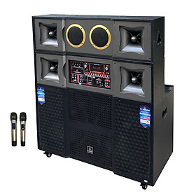 _Nguồn AC, Nguồn DC _Hỗ trợ Bluetooth, guitar in, mic in _Bass loa ≈50cm X 2, treble x 2 ++ Kết hợp 2 loa trung _Phụ kiện 2 mic cầm tay không dây _Kích thước