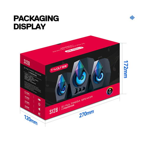 Loa T-Wolf S128 là một bộ loa 2.1 với một loa siêu trầm 5W và hai loa vệ tinh 3Wx2. Bộ loa này còn được trang bị tính năng đèn LED tạo hiệu ứng ánh