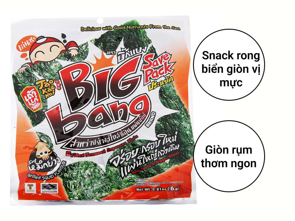 Mua tại TiktokSnack rong biển Big Bang vị mực của Tao Kae Noi là món khoái khẩu khi dùng chung với các loại thức nhấm như bia hoặc rượu trong những dịp gặp gỡ vui chơi hay