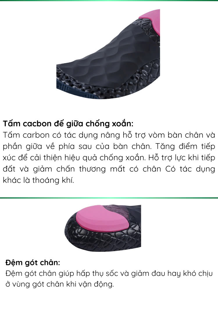 Vật liệu EVA mật độ riêng mềm dẻo, kết hợp đệm giảm chấn banh bàn chân polymer êm ái sẽ ôm sát theo bước chân giúp hoàn trả năng lượng tối đa khi vận động - Tăng sức bền khi chơi thể thao