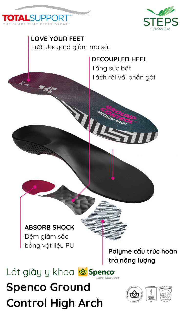 Thiết kế đặc biệt, cải tiến mới của Spenco Total Support, đế chỉnh hình Spenco Ground Control với cấu trúc nâng linh hoạt ôm sát đủ ba khung vòm chân trợ lực tối ưu cho bước chân khi mang.