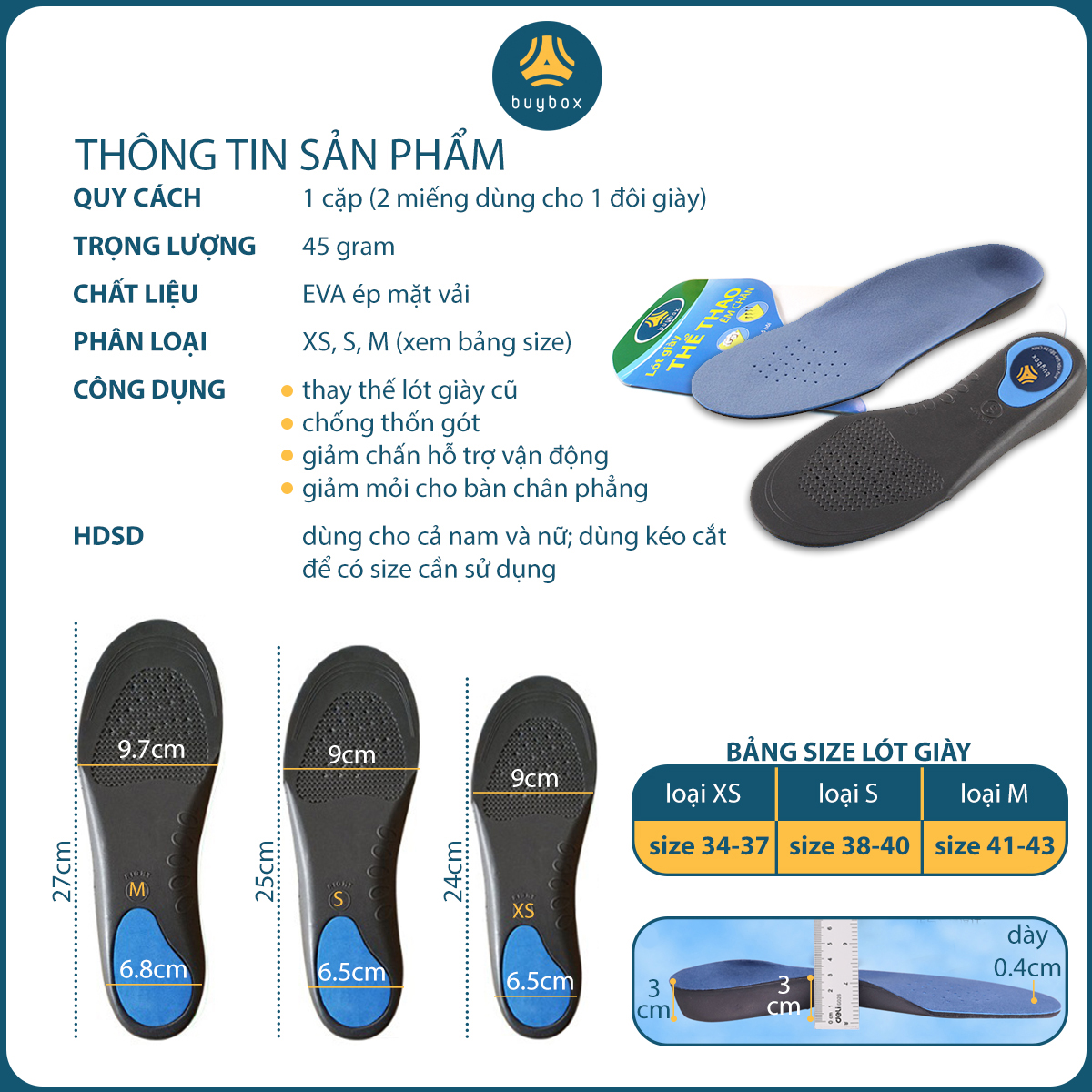 - Bảo quản lót giày ở nơi thoáng mát, tránh ánh nắng trực tiếp và nơi có nhiệt độ cao. DỊCH VỤ buybox buybox luôn nỗ lực hết mình để đem đến sự hài lòng nhất cho khách hàng. Hãy cho chúng tôi biết bằng cách đánh giá cho buybox nhé. Mỗi đánh giá của bạn là một lời động viên để buybox hoàn thiện hơn. NHẮN GỬI KHÁCH HÀNG buybox mong muốn đồng hành trên con đường mang lại sự ÊM ÁI & THOẢI MÁI nhất cho đôi chân Khách Hàng. Luôn mang đến những sản phẩm chất lượng và giá thành tốt nhất, không ngừng tiếp thu để cải tiến nhằm phục vụ tôn chỉ chung - MANG LẠI SỰ THOẢI MÁI NHẤT CHO ĐÔI CHÂN CỦA BẠN!!! "buybox - NGƯỜI BẠN THÂN CỦA ĐÔI CHÂN"