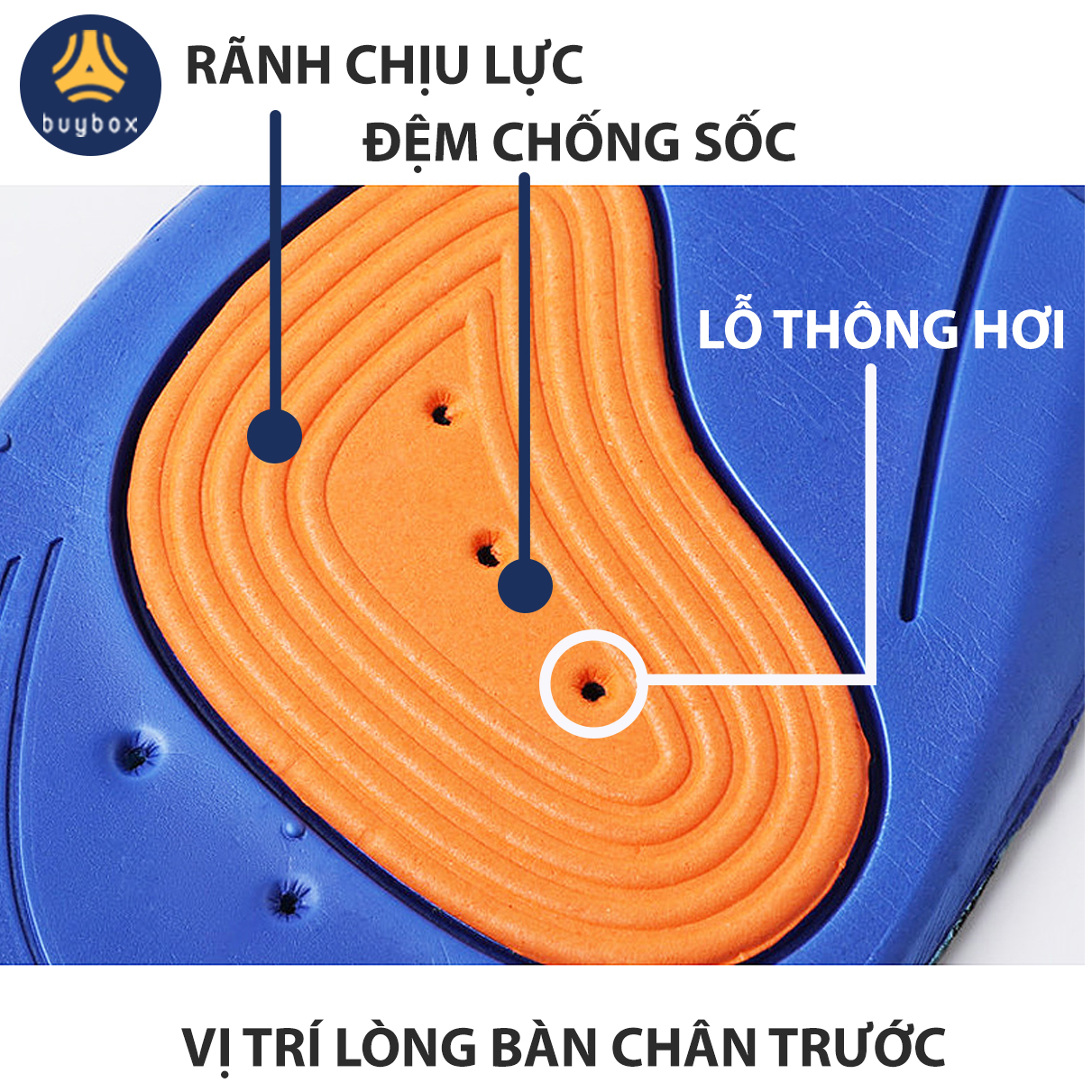 • Lót giày thể thao EVA có 2 đệm chống sốc ở 2 vị trí quan trọng là gót và lòng bàn chân dưới các ngón, giảm áp lực lên các huyệt đạo, mô cơ.