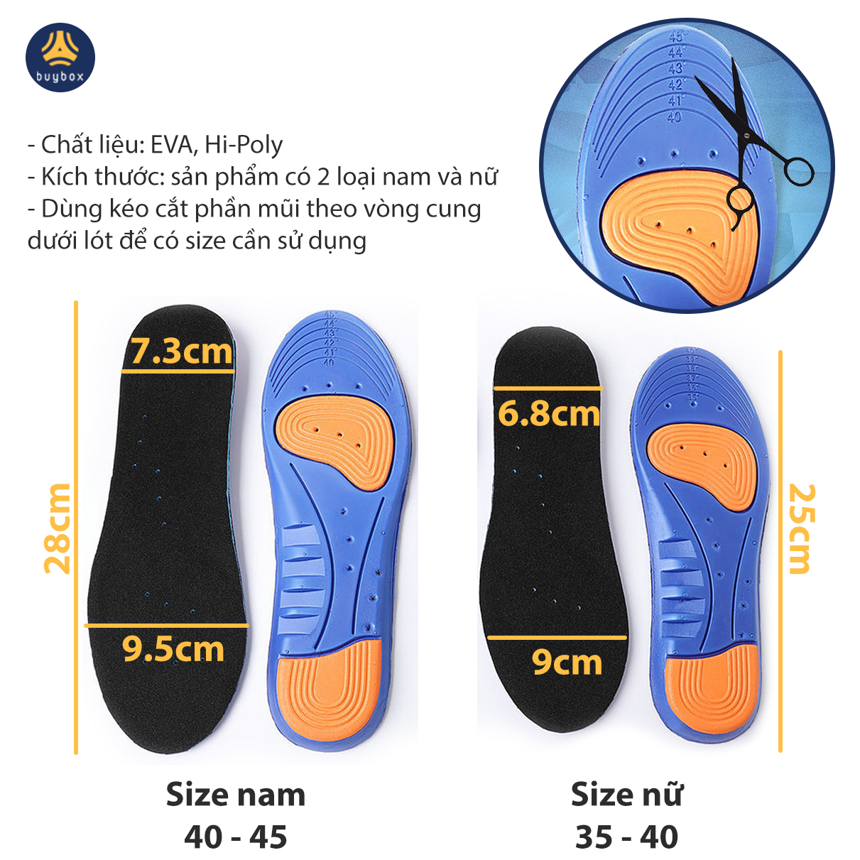 • Sản phẩm chỉ có 2 loại kích thước, dùng chung cho các size giày nữ 35 - 36 - 37 - 38 - 39 - 40 và loại nam dùng cho size 40 - 41 - 42 - 43 - 44 - 45 - 46. Sử dụng kéo cắt theo đường cong mặt dưới lót để có size cần dùng.