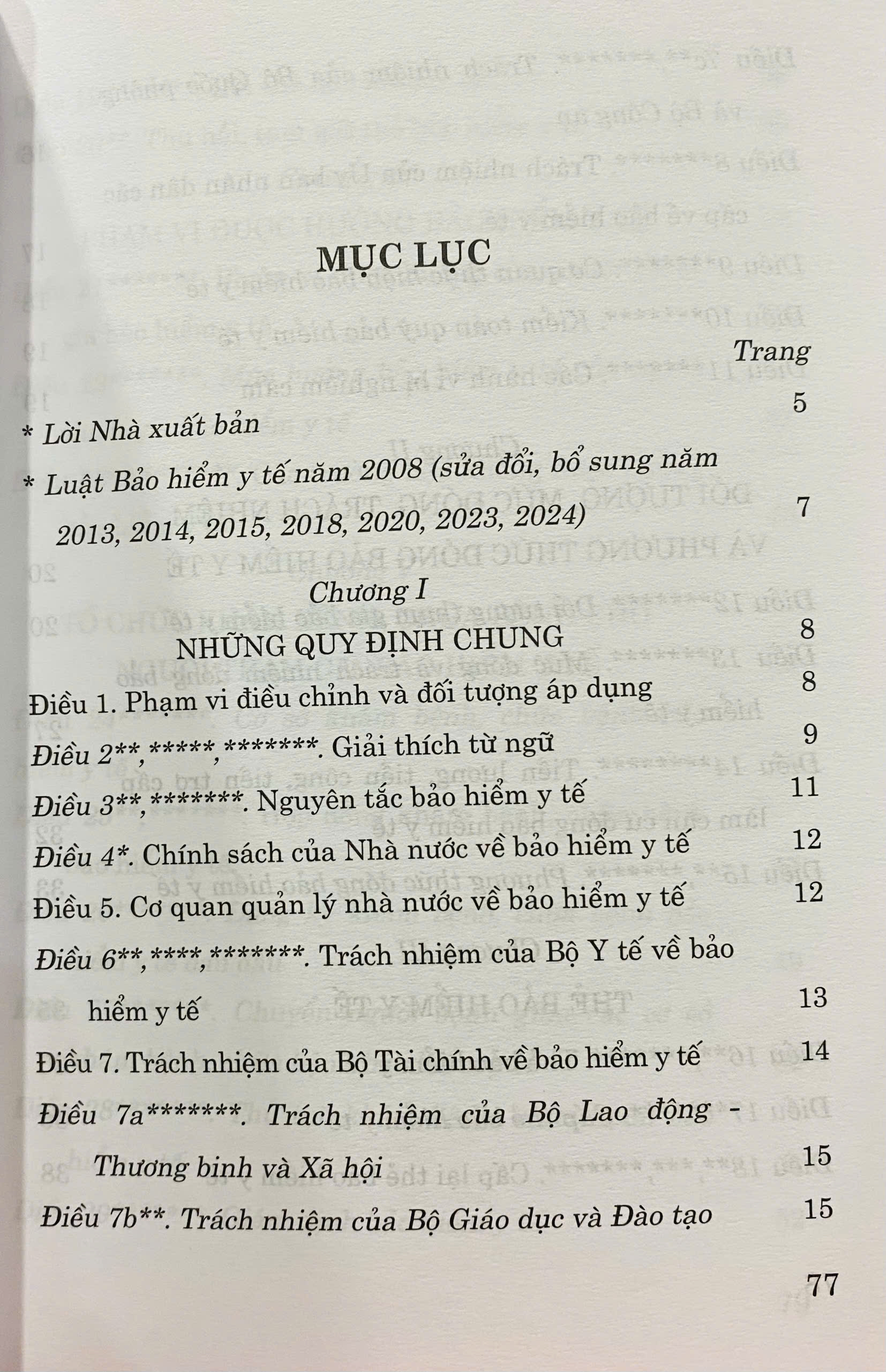 Để tạo điều kiện thuận tiện cho bạn đọc trong việc tra cứu và áp dụng Luật Bảo hiểm y tế, Nhà xuất bản Chính trị quốc gia Sự thật xuất bản cuốn sách Luật Bảo hiếm y tế năm 2008 (sửa đổi, bổ sung năm 2013, 2014, 2015, 2018, 2020, 2023, 2024). Nội dung cuốn sách là văn bản luật được hợp nhất giữa Luật Bảo hiểm y tế năm 2008 và bảy văn bản luật nêu trên.