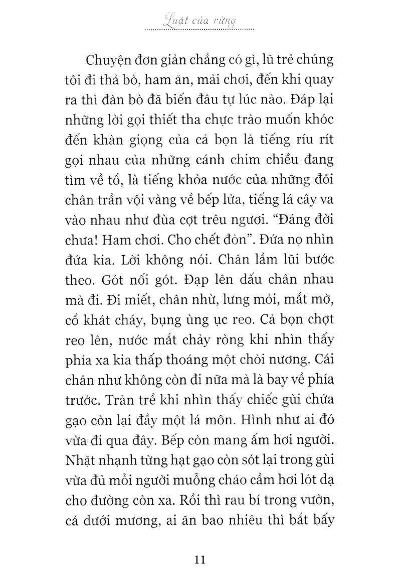 Nhiều người hỏi tôi tập tản văn Luật của rừng dành cho đối tượng nào vậy? Người lớn, con nít hay dở dở ương ương tuổi mới lớn? Một câu hỏi với tội thật khó trả lời. Tuổi nào mà không cần yêu thương, chia sẻ. Tuổi nào mà không có ước mơ và hy vọng. Tôi chỉ là người kể ra những luật lệ của rừng mà mình là chứng nhân đã từng tham dự, còn cảm nhận về Luật của rừng khắc nghiệt hay bao dung lại phụ thuộc vào cảm quan riêng của mỗi người sau khi đọc hết trang sách.