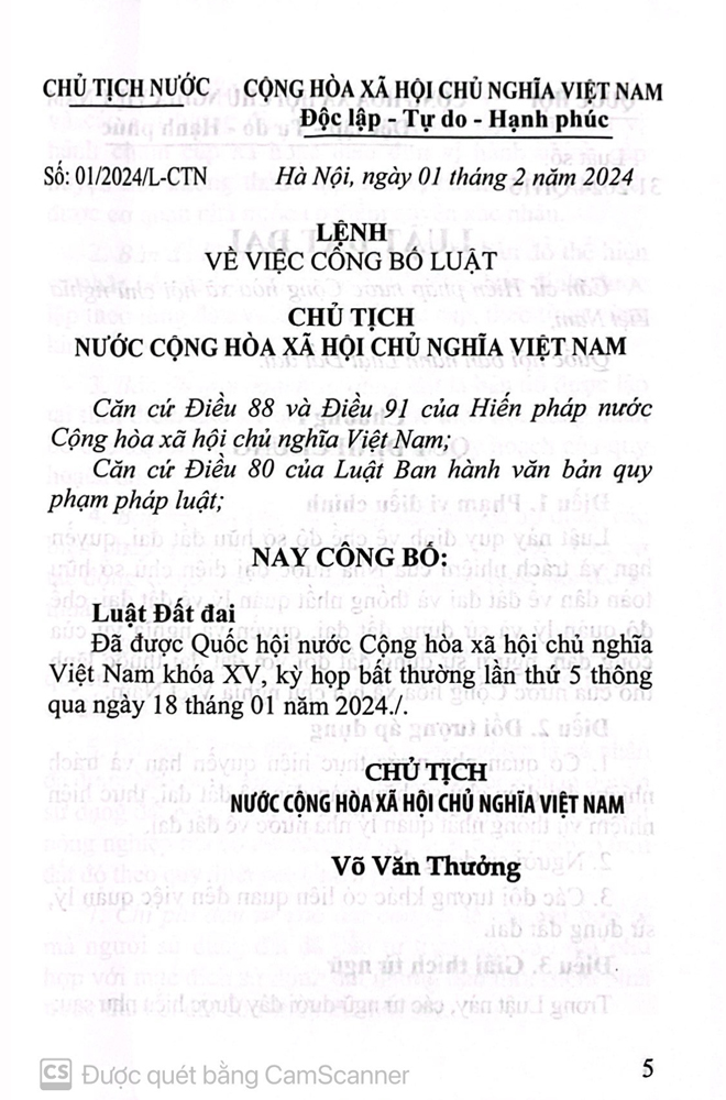 Luật Đất đai số 31/2024/QH15 được Quốc hội nước Cộng hòa xã hội chủ nghĩa Việt Nam khóa XV, kỳ họp bất thường lần thứ năm thông qua ngày 18 tháng 01 năm 2024,