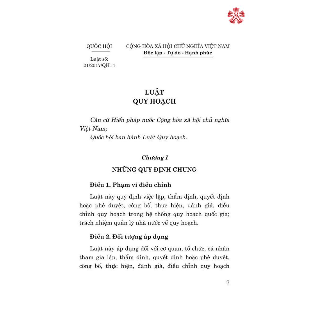 Mua tại TiktokLuật quy hoạch đã được Quốc hội nước Cộng hòa xã hội chủ nghĩa Việt Nam khóa XIV, kỳ họp thứ 4 thông qua ngày 24 tháng 11 năm 2017. Luật gồm 6 chương và 59 điều quy định việc lập, thẩm định, quyết định hoặc phê duyệt, công bố, thực hiện, đánh giá, điều chỉnh quy hoạch trong hệ thống quy hoạch quốc gia; trách nhiệm quản lý nhà nước về quy hoạch. Luật này có hiệu lực thi hành từ ngày 01 tháng 01 năm 2019.