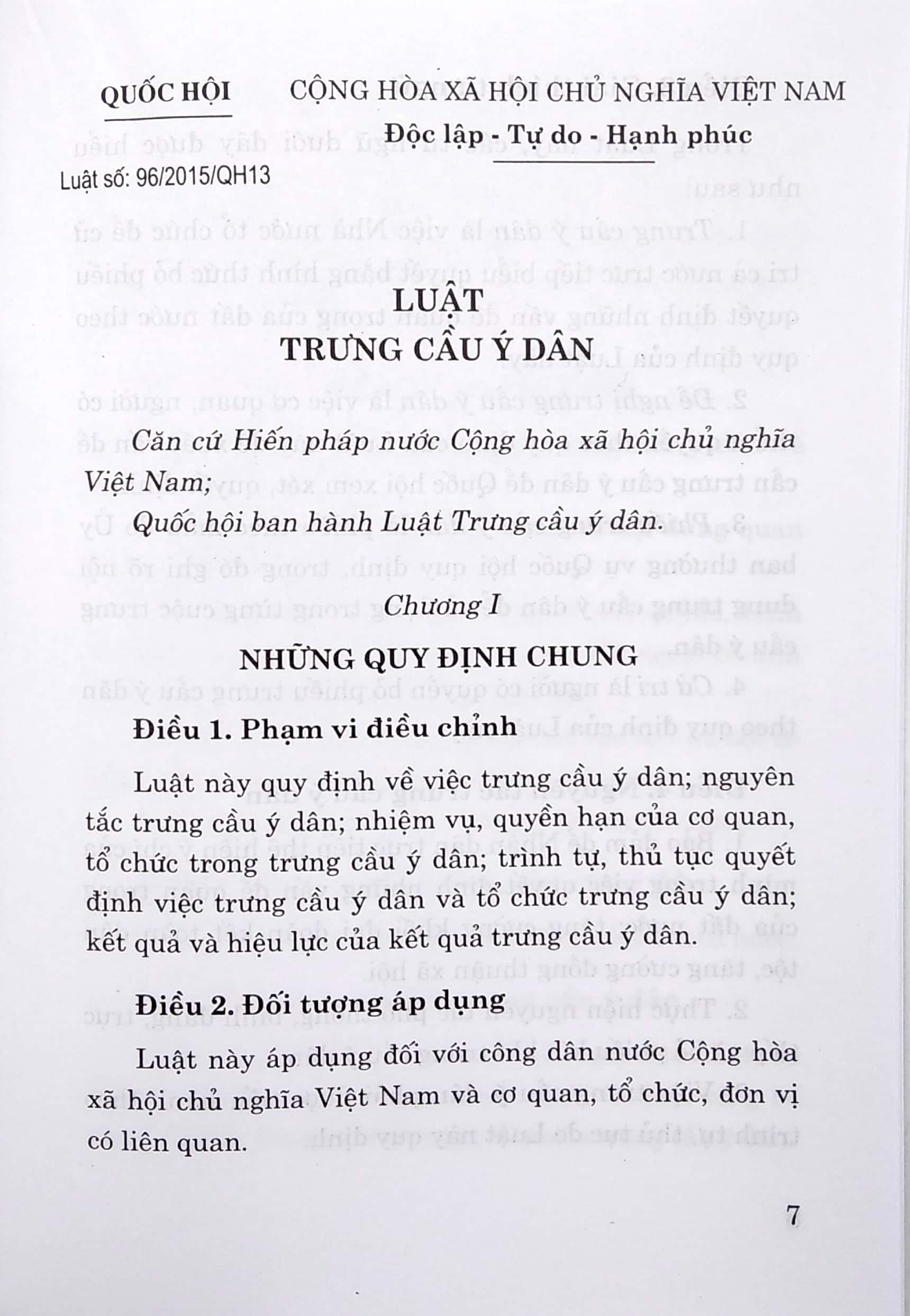 Mua tại TiktokLuật Trưng cầu ý dân (hiện hành) được Quốc hội khóa XIII, kỳ họp thứ 10 thông qua ngày 25/11/2015, có hiệu lực thi hành từ ngày 01/7/2016. Luật gồm 8 chương, 52 điều, quy định về việc trưng cầu ý dân; nguyên tắc trưng cầu ý dân; nhiệm vụ, quyền hạn của cơ quan, tổ chức trong tổ chức trưng cầu ý dân; trình tự, thủ tục quyết định việc trưng cầu ý dân và tổ chức trưng cầu ý dân; kết quả và hiệu lực của kết quả trưng cầu ý dân…
