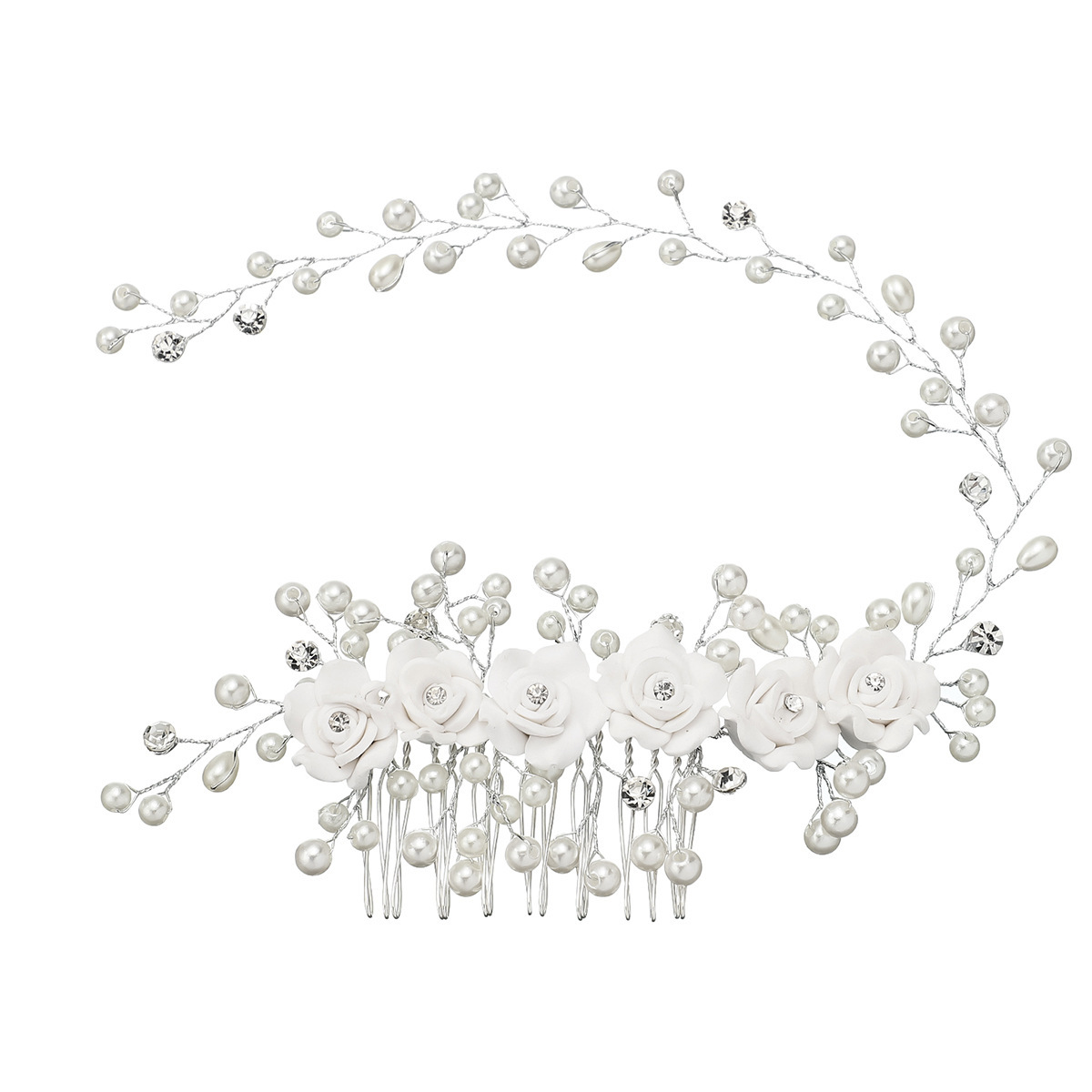 Trâm cài tóc cô dâu thiết kế ngọc trai và hoa 5 canh mềm mại, nữ tính. Tôn lên vẻ đẹp cho mái tóc xinh. Thích hợp trang điểm, make up cô dâu, trang điểm