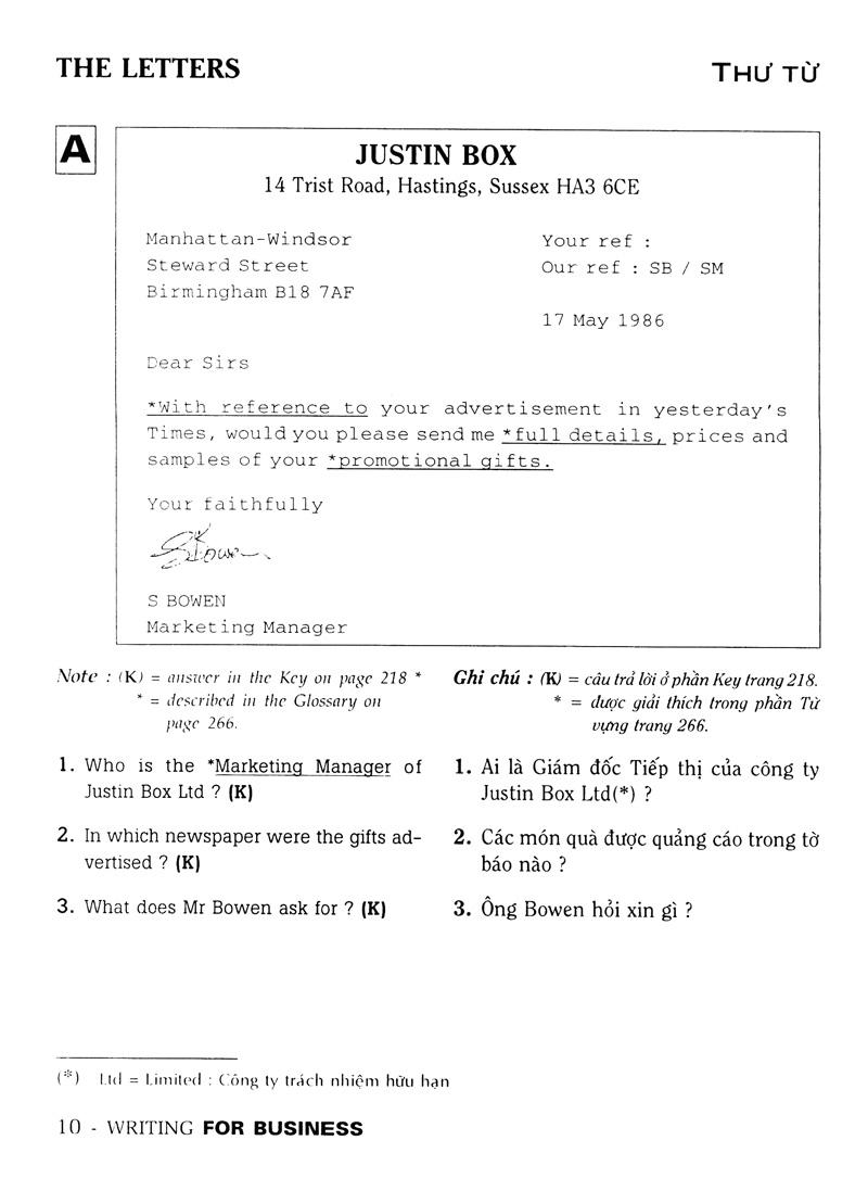 Mua tại Tiktokbook has been very carefully organised to give systematic presenttion and practice of the main functional patterns used in writing the most common forms of business letters. Each unit is task based and deals with a small number os functions. Students are given extensive graded praded practive in writing full letters. An answer key is provided for many of the exercises so that the material is suitable for use either by a teacher with a class or by students studying on their