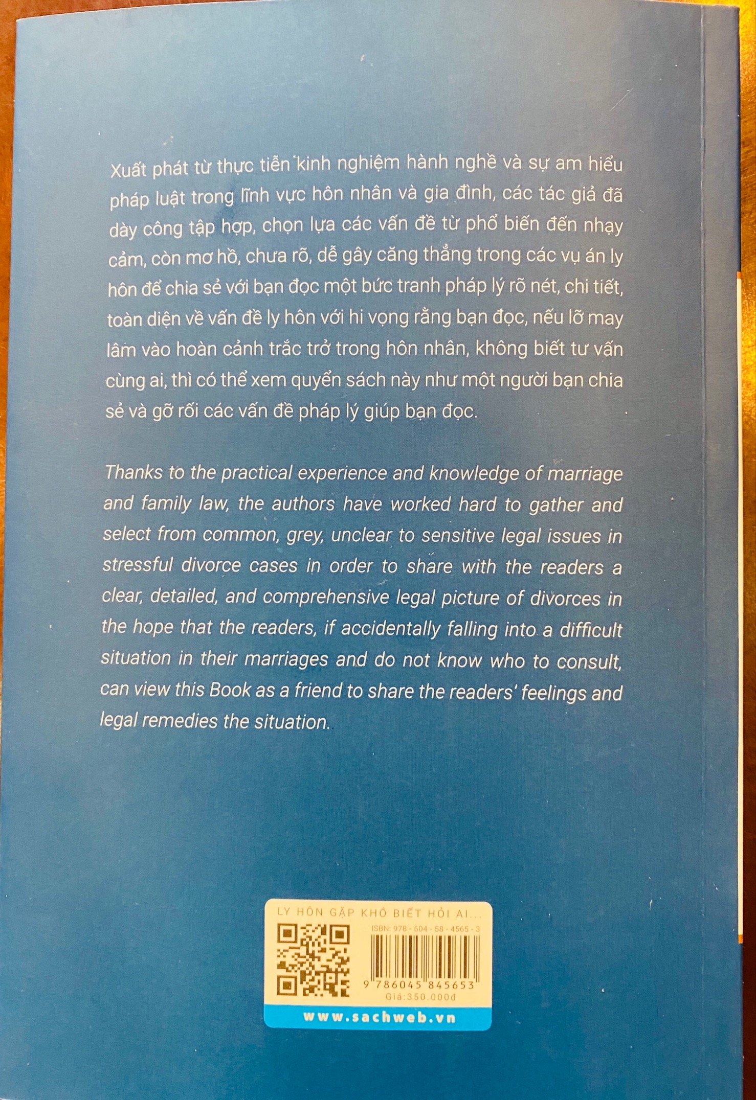 Quyển sách LY HÔN GẶP KHÓ BIẾT HỎI AI được phát hành vào tháng 04/2020. Nội dung sách gồm: 05 Chương trình bày dưới hình thức song ngữ Việt - Anh. Màu sắc chủ đạo của bìa sách: Màu xanh dương và trắng. Phạm vi phát hành: tập trung tại các Nhà sách TP. Hồ Chí Minh, Hà Nội và Đà Nẵng.