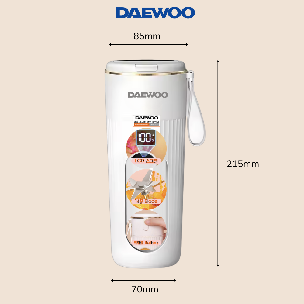 MÁY XAY CẦM TAY DAEWOO DWBL-3424 (340ML) – LY XAY SINH TỐ, TRÁI CÂY MINI TIỆN LỢI, MẠNH MẼ, AN TOÀN   Bạn đang tìm kiếm một chiếc máy xay cầm tay nhỏ gọn, hiệu suất cao, đẹp mắt và tiện lợi để mang theo bên mình? Máy xay sinh tố mini Daewoo DWBL-3424 chính là lựa chọn hoàn hảo – kết hợp giữa thiết kế Hàn Quốc hiện đại, công nghệ thông minh và tính tiện dụng vượt trội cho cuộc sống năng động!   ƯU ĐIỂM VƯỢT TRỘI CỦA LY XAY CẦM TAY DAEWOO DWBL-3424   Thiết kế cao cấp, nhỏ gọn – Chỉ 215mm x 85mm, trọng lượng nhẹ, dễ cầm nắm và bỏ túi xách, balo. Dung tích 340ml tiện lợi – Vừa đủ cho 1 lần xay sinh tố, nước ép, protein shake hoặc sữa hạt. Công suất mạnh 50W – Kết hợp lưỡi dao 14 cánh bằng inox 304, giúp xay nhuyễn nhanh và giữ nguyên dưỡng chất. Màn hình LCD cảm ứng hiện đại – Hiển thị phần trăm pin còn lại theo thời gian thực. Pin dung lượng lớn 2400mAh – Sạc 1 lần, dùng nhiều lần. Có thể sạc bằng sạc điện thoại, máy tính, pin dự phòng, sạc ô tô thông qua cổng Type-C tiện lợi. Cơ chế hoạt động an toàn – Máy chỉ xay khi nắp đóng đúng và chặt, đảm bảo không bị trào hay rò rỉ. Dây đeo silicone dày dặn – Giúp mang theo dễ dàng hơn khi đi làm, tập gym, đi học hoặc du lịch.   ỨNG DỤNG ĐA NĂNG – 1 CHIẾC MÁY, NHIỀU CÔNG DỤNG • Xay sinh tố trái cây tươi • Pha protein shake – hỗ trợ người tập thể hình • Xay rau củ detox – hỗ trợ giảm cân • Dễ dàng mang đi làm, đi học, du lịch, picnic…   PIN KHỦNG – SẠC NHANH – DÙNG DÀI • Dung lượng lớn 2400mAh – Dùng 8–10 lần sau mỗi lần sạc đầy • Sạc nhanh Type-C – Cắm sạc mọi nơi như sạc điện thoại • Nút cao su chống bụi, chống nước – Bảo vệ cổng sạc an toàn hơn   AN TOÀN & TIỆN DỤNG TUYỆT ĐỐI • Máy chỉ hoạt động khi nắp được đóng đúng – chống tràn, chống rò rỉ • Lưỡi dao inox 304 – bền bỉ, không gỉ, an toàn cho sức khỏe • Màn hình LCD giúp bạn theo dõi trạng thái pin mọi lúc • Cảm ứng nhạy – thao tác đơn giản với 1 nút nhấn