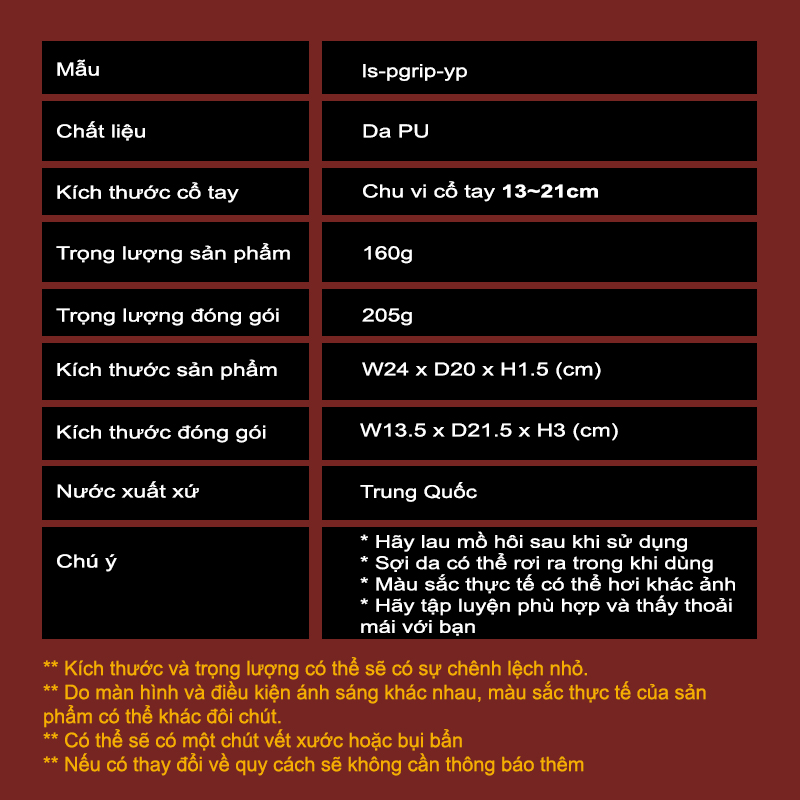Thông số kỹ thuật - Thương hiệu: AOLIKES - Chất liệu: Da bò hai lớp Màu sắc: Nâu - Kích thước: Kích thước phù hợp mọi tay, có thể điều chỉnh. - Tính năng: Tránh