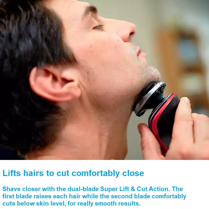 • Cạo sát mà không cắt xước vào da. Hệ thống lưỡi cạo Super Lift & Cut Action của chúng tôi có các đầu cạo được thiết kế lượn tròn trượt êm ái trên khuôn mặt và bảo vệ làn da.