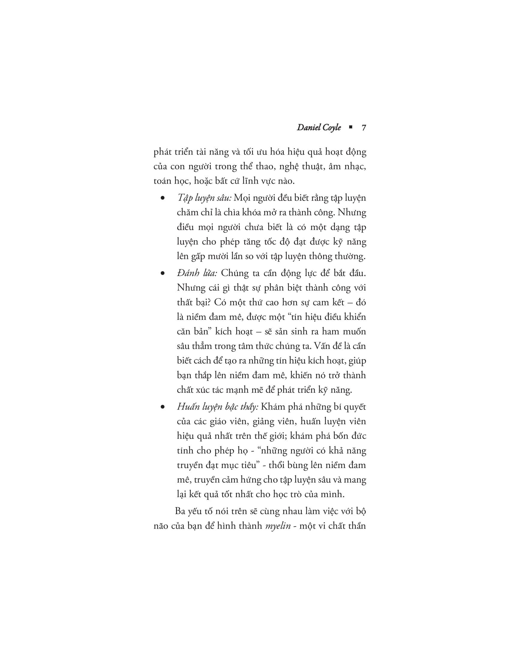 Dựa trên những thành tựu xuất sắc của ngành thần kinh học và nghiên cứu mới nhất trong quá trình đi tới 9 địa chỉ sản sinh ra rất nhiều tài năng của thế giới – từ sân bóng chày ở vùng Ca-ri-bê đến học viện âm nhạc cổ điển phía bắc New York – Coyle đã chỉ ra 3 yếu tố then chốt cho phép bạn phát triển tài năng và tối ưu hóa khả năng của m.ình trong các lĩnh vực thể thao, nghệ thuật, âm nhạc, toán học hay bất kỳ điều gì khác.