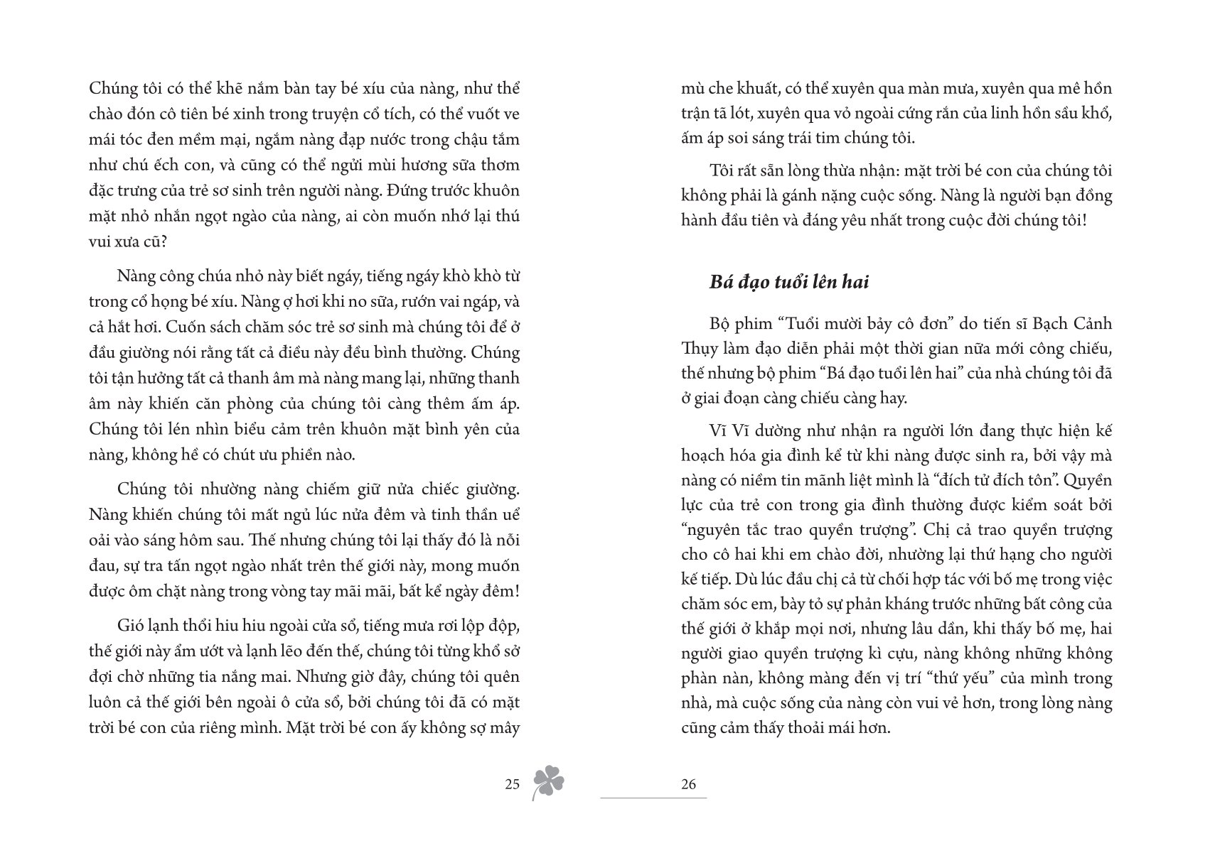 Mua tại TiktokMặt trời bé con là tập tản văn nhẹ nhàng mà giàu xúc cảm về gia đình, vừa kể, vừa chiêm nghiệm dưới góc nhìn của nhân vật “tôi” – người chồng học cách chung sống, thấu hiểu vợ mình mỗi ngày; người cha lắng lo, trưởng thành cùng ba cô con gái bé nhỏ trên từng chặng đường, cột mốc quan trọng suốt thời thơ ấu của các con. Những câu chuyện đời thường từ ăn, ngủ, nghỉ, học tập tới bao giây phút gần gũi, ấm áp của cả gia đình được kể, tả lại bằng nhiều ví von sáng tạo, đáng yêu, sâu sắc mà tràn đầy tình yêu thương. Cuốn sách là một trong những tác phẩm văn học thiếu nhi kinh điển của nền văn học thiếu nhi Đài Loan và được xem như “Kinh Thánh” viết về đề tài gia đình, kiệt tác dành cho bạn đọc từ 9 đến 99 tuổi. … “Gió lạnh hiu hiu ngoài cửa sổ, mưa rơi lộp độp, thế giới này ẩm ướt và lạnh lẽo đến thế, chúng tôi từng khổ sở đợi chờ những tia nắng mai. Nhưng giờ đây, chúng tôi quên luôn cả thế giới bên ngoài ô cửa sổ, bởi chúng tôi đã có mặt trời bé con của riêng mình. Mặt trời bé con ấy không sợ mây mù che khuất, có thể xuyên qua màn mưa, xuyên qua mê hồn trận tã lót, xuyên qua vỏ ngoài cứng rắn của linh hồn sầu khổ, ấm áp soi sáng trái tim chúng tôi.” GIẢI THƯỞNG SÁNG TÁC VĂN HỌC TRUNG SƠN (ĐÀI LOAN), HẠNG MỤC CỐNG HIẾN ĐẶC BIỆT GIẢI THƯỞNG BĂNG TÂM DÀNH CHO SÁCH THIẾU NHI (2014)