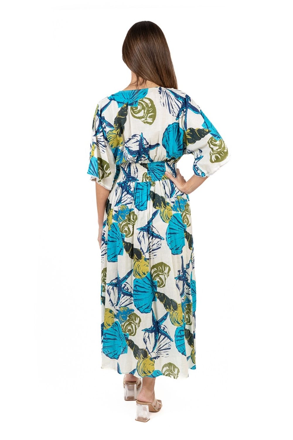 Maxi Cổ V Cotton Isla Bonita, chất liệu lụa mềm mại, cao cấp, nền vải trắng trang nhã họa tiết xanh tinh tế. Có thể mặc cổ V hoặc kéo thành trễ vai. Eo thun