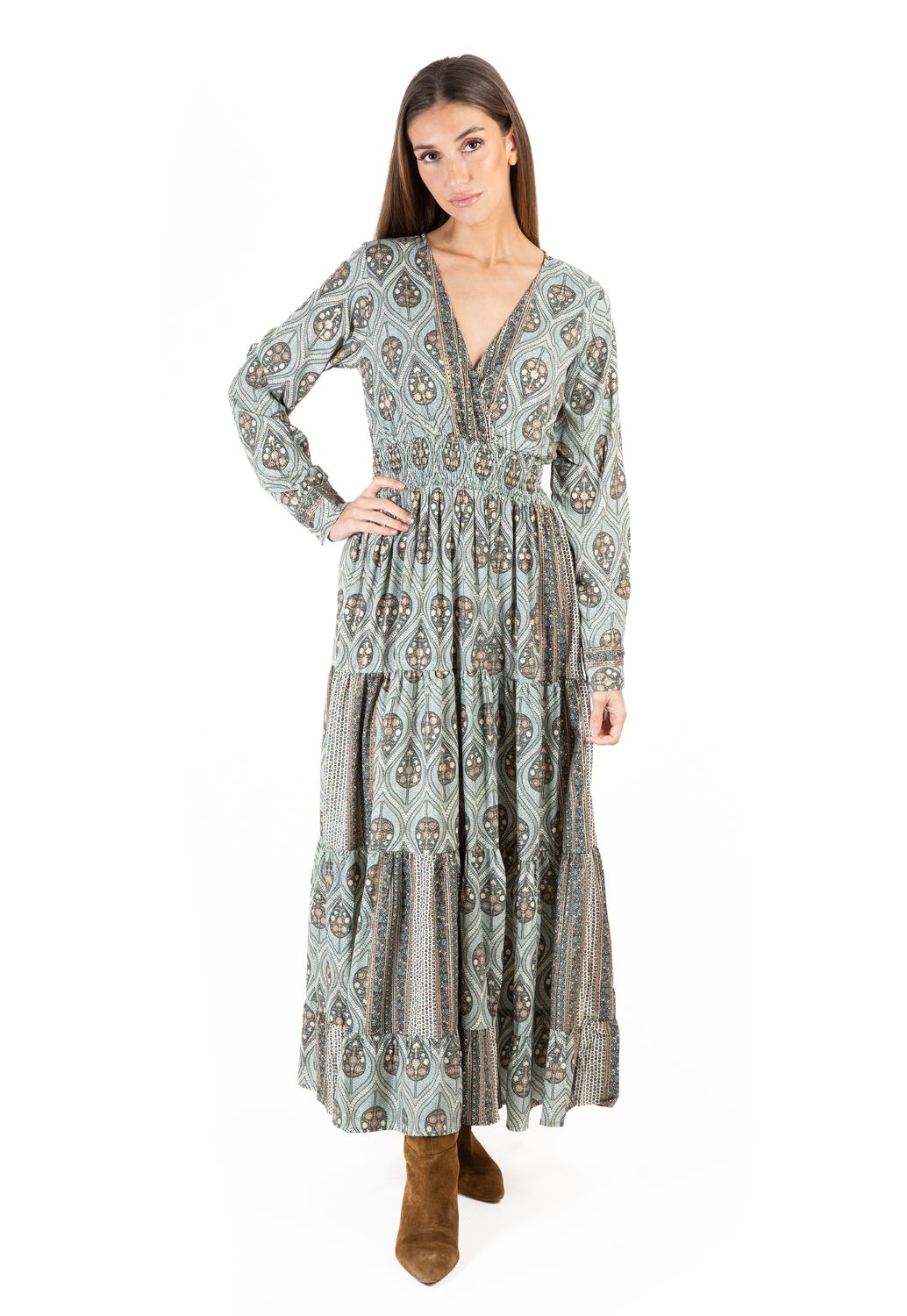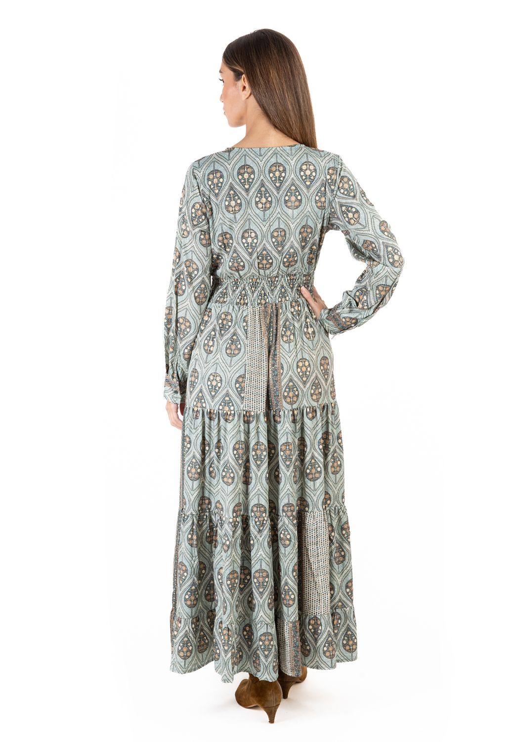 Maxi Boho Dài Tay Kết Cườm Cotton Isla Bonita, chất liệu cotton cao cấp, mềm mại, nổi bật phần ngực trước kết cườm sang trọng. Họa tiết thổ cẩm độc đáo. Phom suông. Dài Đầm