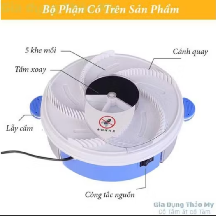 Hướng Dẫn Sử Dụng Máy bắt ruồi tự độngB1: Cho mồi nhử ruồi ( sơ mít, thức ăn thừa, mật ong pha nước ...) vào khay tròn lõm trên bề mặt máyB2: Bật công tắc khởi động ( khi đã nắp pin hoặc cắm vào ngu...