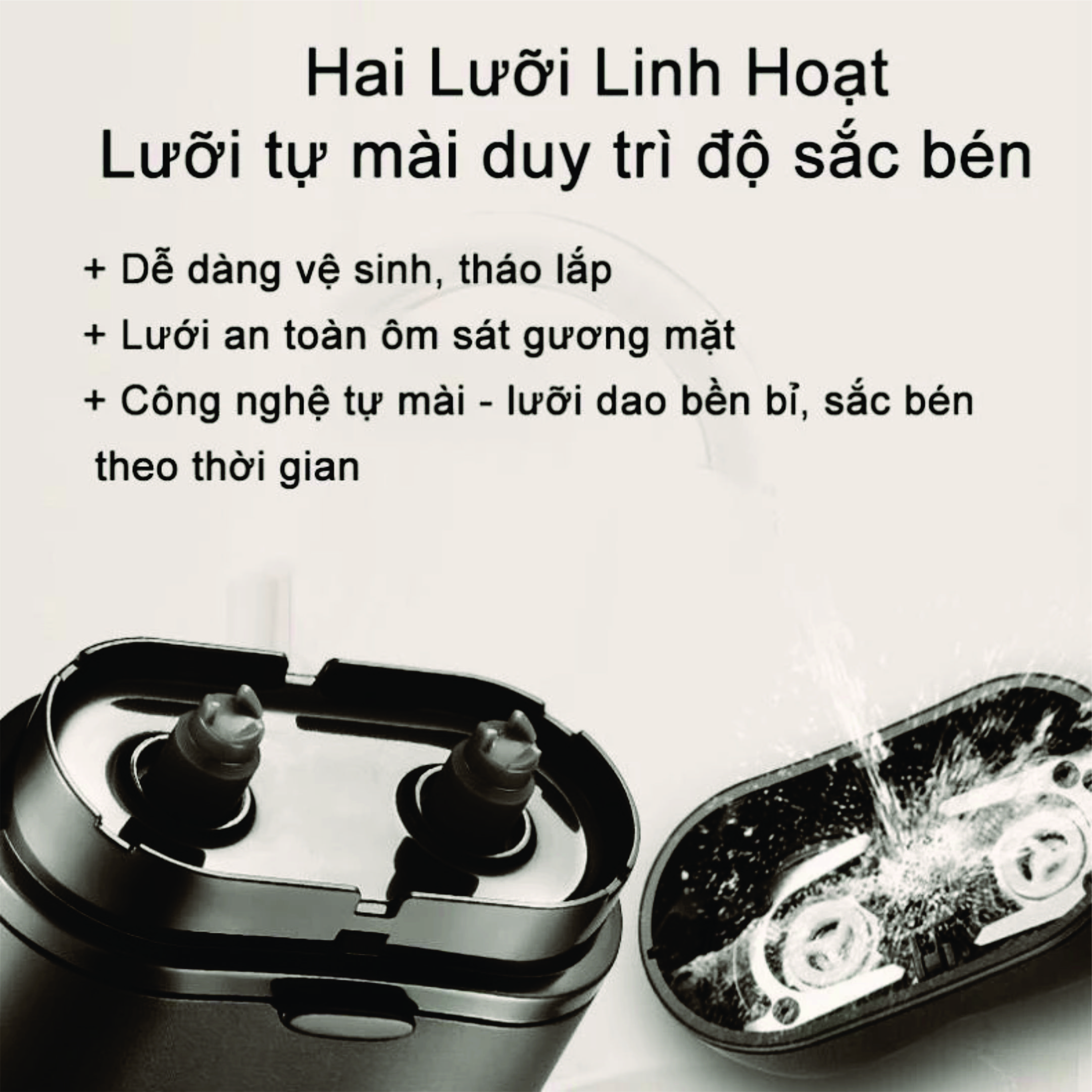 - Sử dụng 2 lưỡi kép có thể cạo khô hoặc ướt đều được