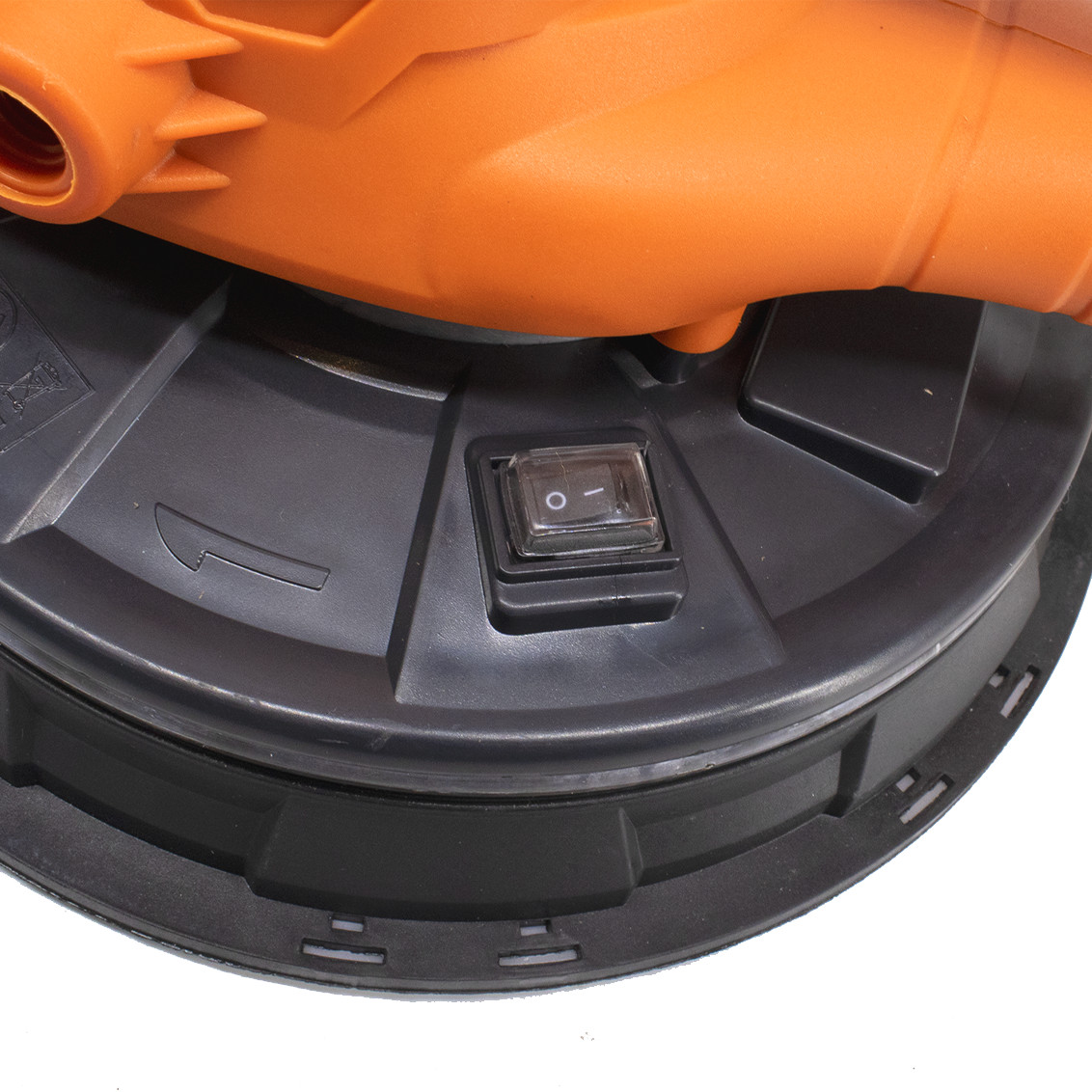 Máy chà nhám sơn tường được trang bị sẵn 6 miếng chà nhám 180mm, 1 ống ruột gà và 1 túi bụi. Vỏ máy được làm từ nhựa cao cấp, có công tắc bóp và nút khóa cò bóp để duy trì thao tác chà liên tục.