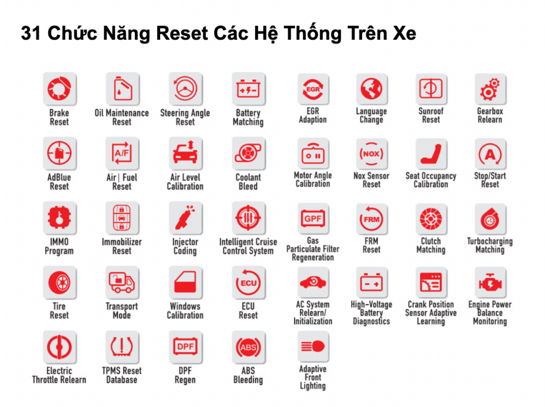 - Đầy đủ chức năng chẩn đoán cơ bản: Tự nhận diện VIN, đọc xóa lỗi, xem dữ liệu động, kích hoạt kiểm tra hệ thống, …