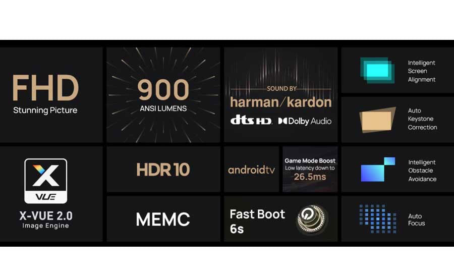* Thông tin sản phẩm: Loại máy: Máy chiếu, tối đa 200 inch Hệ điều hành: Android 9.0 Độ sáng (Lumen ANSi): 650 lumens Độ tương phản: NTSC, HDR10+ Công nghệ hình ảnh: Máy quang