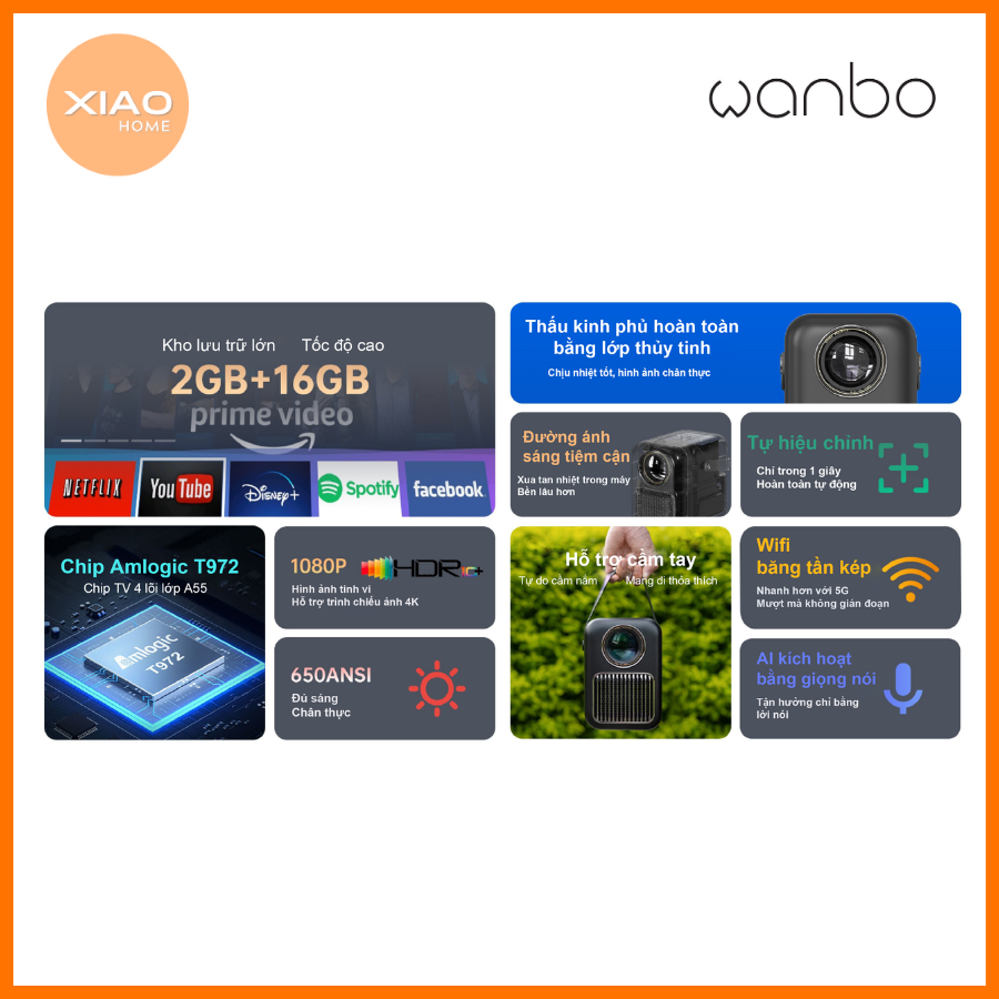 Máy chiếu mini Xiaomi Wanbo T6R Max Full HD tích hợp loa, Điều khiển bằng giọng nói/ điện thoại, Có quai xách dễ mang đi, Kèm remote, Kho ứng dụng phong phú, BH 12 tháng