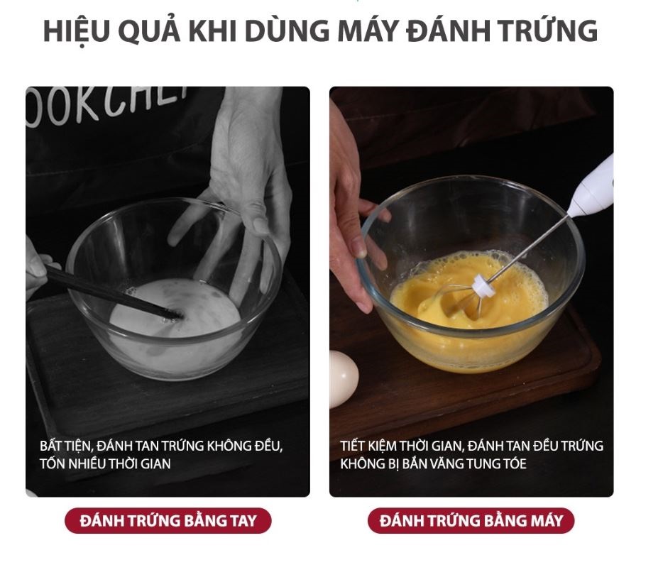 - Với máy đánh trứng tạo bọt, việc đánh trứng hay tạo bọt café sẽ được thực hiện nhanh chóng, nhẹ nhàng hơn và những món bánh sẽ thêm thơm ngon, xốp mềm, còn những ly café sẽ có hương vị tuyệt vời hơn.