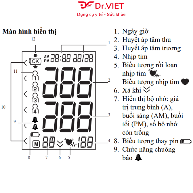 Mô tả: Vị trí đo: bắp tay, độ chính xác cao Tính năng: phân loại kết quả theo thang WHO, cảnh báo nhịp tim bất thường, báo cáo kết quả trung bình 3 lần đo,