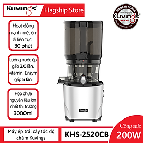 Máy ép chậm Kuvings Series Hands-Free KHS-2520CB với dao cắt và dao ép thế hệ mới “Double Smart Auto Cutting” được thiết kế tự động cắt kép và ép trái cây được làm từ thép cao cấp không gỉ và nhựa dùng trong y tế “ULTEM”, chống ăn mòn, chống bám bẩn không sinh nhiệt cùng công nghệ ép chậm được cấp bằng sáng chế “J.M.C.S” và giải thưởng Sáng tạo nhà bếp danh giá năm 2023 với tốc độ ép 50 vòng / phút sẽ hạn chế quá trình oxy hóa và làm chậm quá trình tách nước của nước ép mà vẫn giữ được hương vị, màu sắc tự nhiên cũng như giữ lại được nhiều Vitamin, Enzym trong trái cây và rau củ nhiều gấp 5 lần so với máy ép truyền thống.