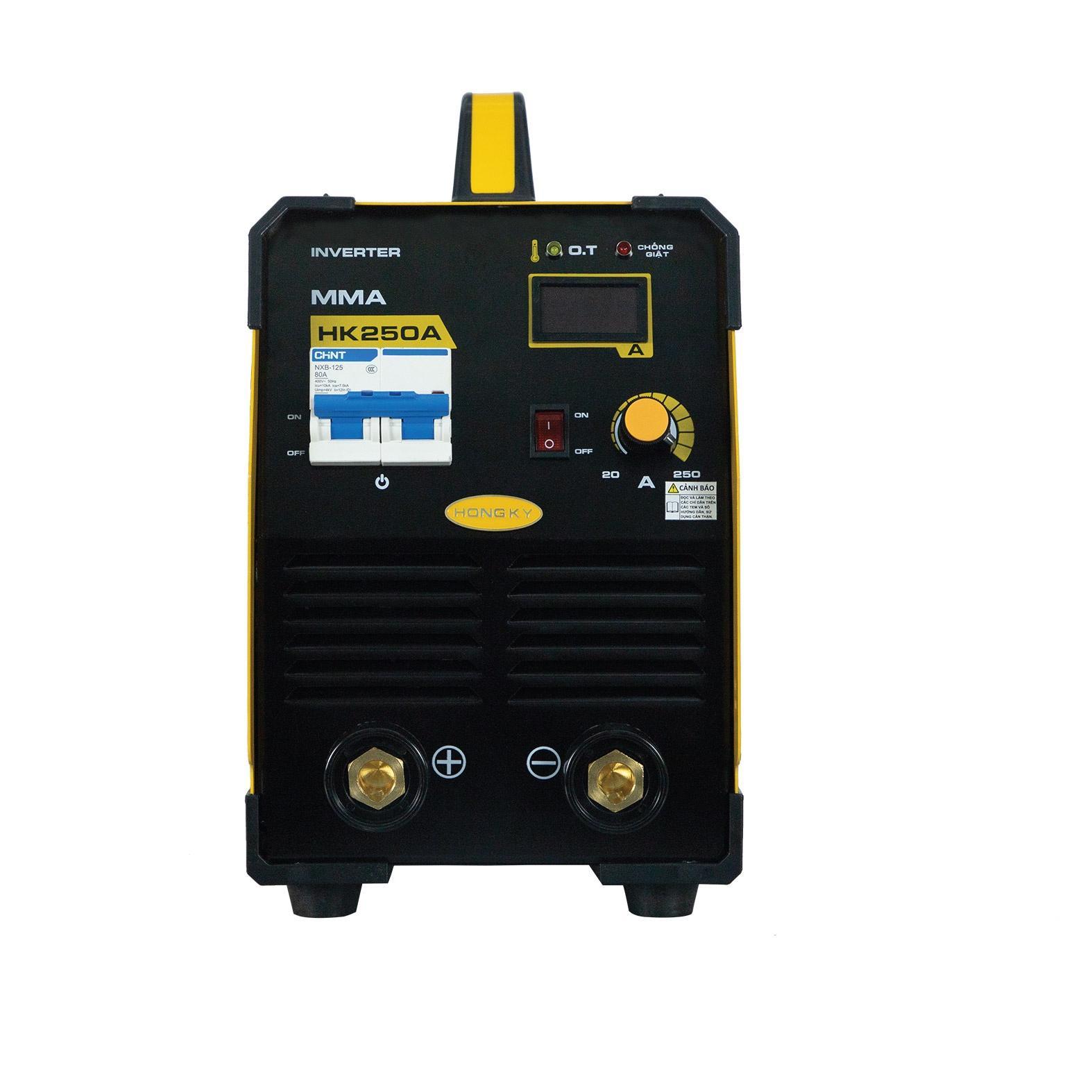 Máy hàn điện tử HK250A có cường độ dòng hàn đạt tới 250A, hàn được que hàn kích thước lên đến 5.0 mm.