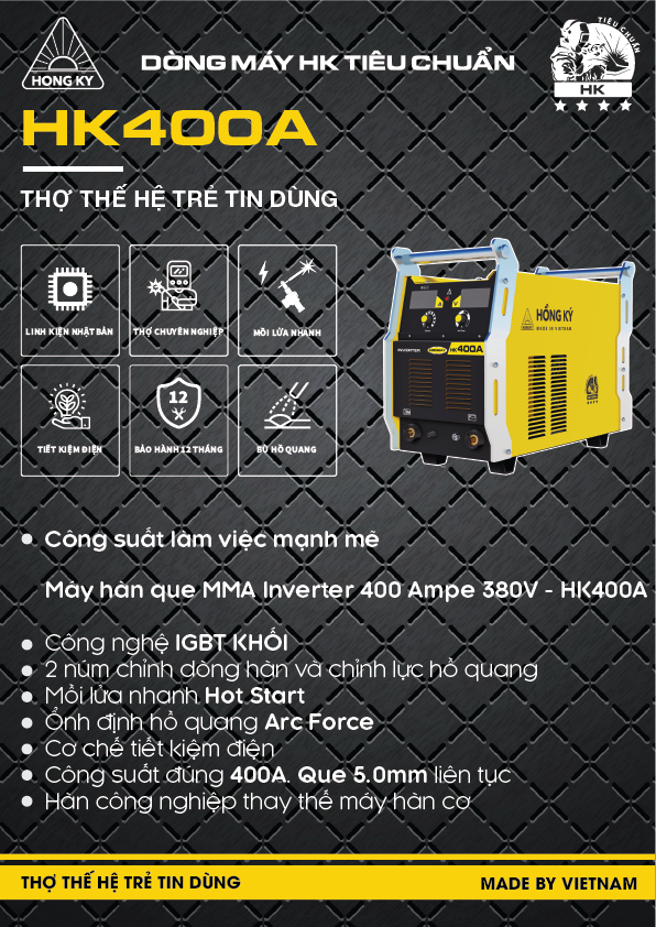 Máy hàn HK400A cung cấp nguồn hàn đầu ra lên đến 400A. Hàn tốt với que hàn có kích thước 2,6 - 6 mm. Hiệu suất chu kỳ làm việc đạt 100% ở 40 C, nên HK400A có thể hàn liên tục ở 400A mà không báo quá nhiệt.