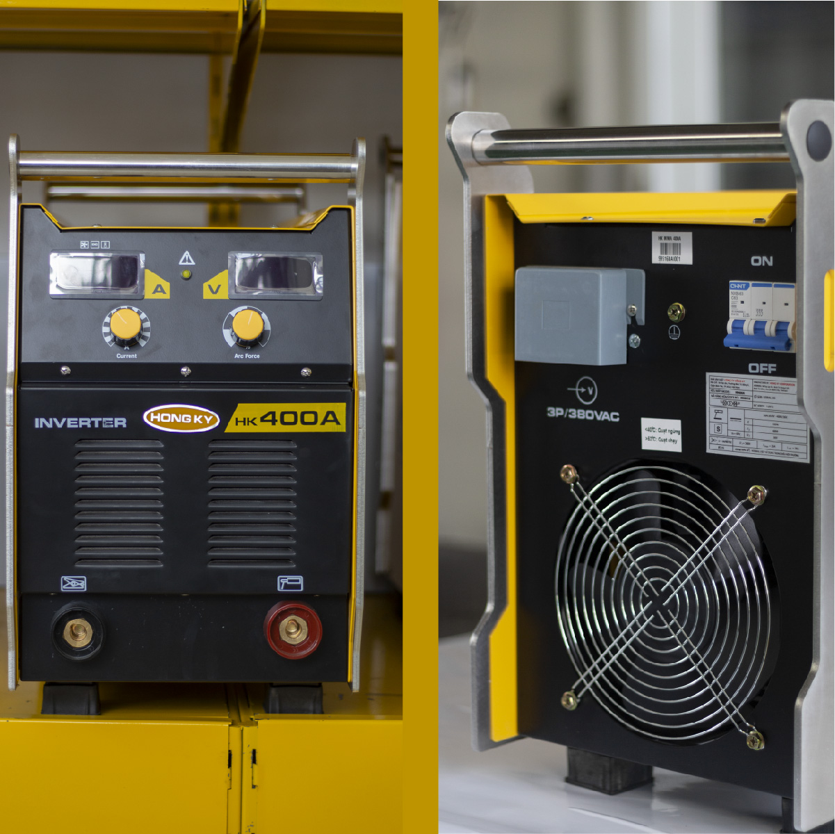 Máy hàn que HK400A được nhận diện bằng 2 màu vàng và đen. Nhìn tổng thể, máy khá to với cân nặng lên đến 33kg.