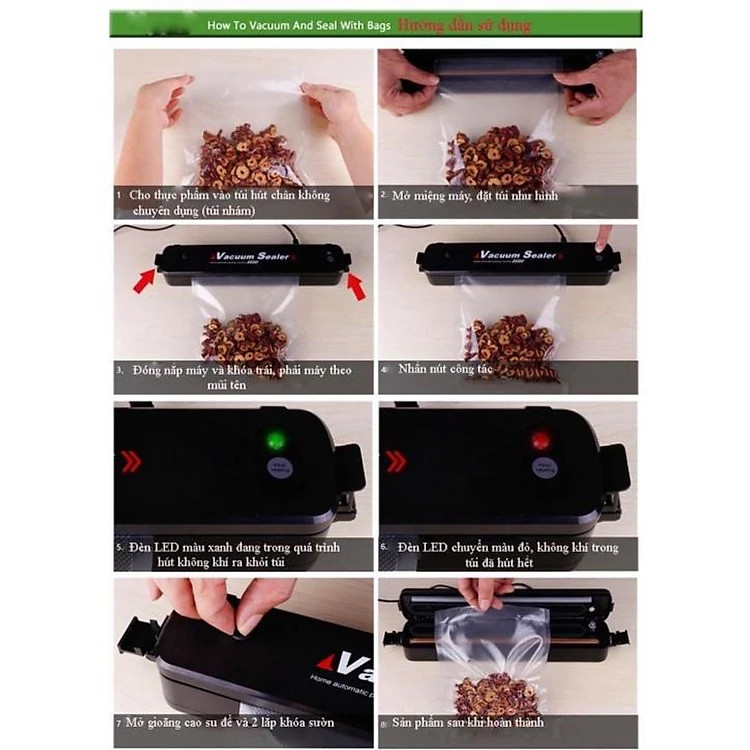 - MÁY CÓ 2 CHẾ ĐỘ: Hút sau đó hàn( dùng với TÚI 1 MẶT NHÁM) Chỉ hàn( dùng được cho mọi loại túi) CÁCH HÚT CHÂN KHÔNG ĐƠN GIẢN VỚI MÁY HÚT CHÂN KHÔNG GIA ĐÌNH VACUUM SEALER Sản phẩm tiện dụng cho gia đình và rất dễ sử dụng, chưa đầy 15 giây là bạn đã có thể đóng gói sản phẩm tốt nhất. Bước 1: Mở lắp cài khóa 2 bên của máy, sau đó cho túi hút đưng thực phẩm vào trong khoang máy(Để miệng túi phẳng, vòi hút ở giữa 2 miệng túi( không được che vòi hút) Bước 2: Cài khóa hai bên nắp máy hút, ẤN TAY LÊN THÂN MÁY và bấm nút “nguồn” máy màu xanh sẽ tự động hút sạch không khí bên trong bao bì.( Bước 3: Sau khi đèn trạng thái bên tay phải chuyển sang màu đỏ, nhấc nhẹ núm cao su bên tay trái của máy NHỮNG ĐIỀU CẦN CHÚ Ý KHI SỬ DỤNG MÁY ÉP CHÂN KHÔNG VACUUM SEALER 1: Không sờ vào bộ phận hàn túi của máy hút chân không khi đang cắm điện 2: Không sử dụng các chất tẩy rửa mạnh 3: Không để máy bị ướt khi mưa hoặc vào nước. 4:Không để các nguồn nhiệt nóng lên trên máy 5: Tránh xa tầm tay trẻ em. 6: Máy không hút nước, không hút thực phẩm dạng bột.