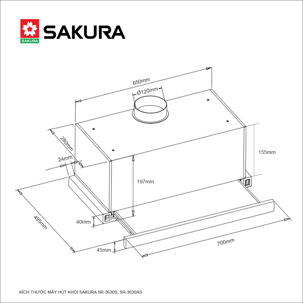 THÔNG SỐ KỸ THUẬT MÁY HÚT MÙI SAKURA SR-3630S • Máy hút khói SAKURA âm tủ • Hút xả trực tiếp bằng ống thoát • Khử mùi bằng than hoạt tính • Thân máy