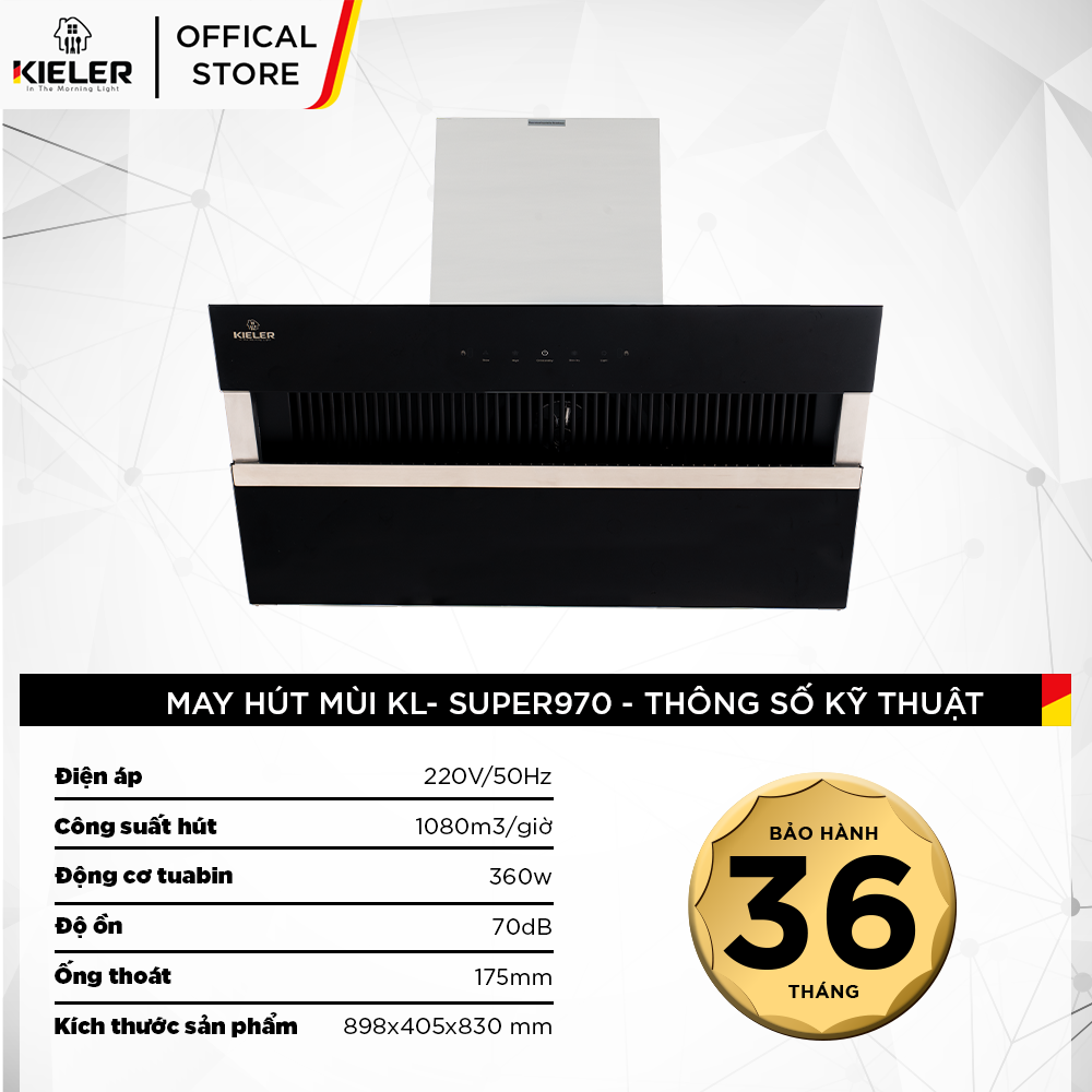 THÔNG SỐ KỸ THUẬT - Tên sản phẩm: Máy hút mùi KIELER KL-SUPER970 công suất hút cao, không gây tiếng ồn, kiểu vát kính sang trọng, điều khiển bằng cử chỉ - Thương hiệu: