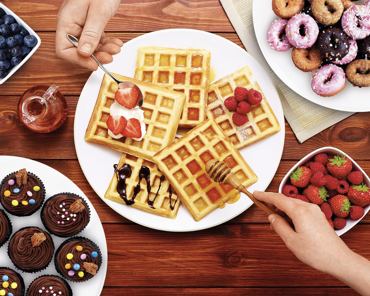 - Hãy chuẩn bị một bữa sáng ngon miệng vào mỗi buổi sáng với những chiếc waffle giòn tan và trang trí với những phụ gia và si-rô thơm ngon không giới hạn.