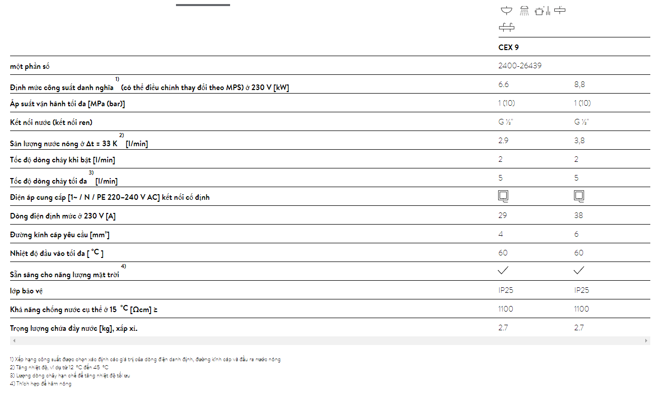Thông số kỹ thuật cơ bản CÓ BƠM/KHÔNG CÓ BƠM Bơm DC LOẠI Màn hình LCD Nguồn điện 220 V, 50 Hz Công suất định mức 4,5 kW Áp lực nước Tối thiểu 0,05 kgf/cm²